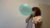 Curly Luna doing the balloon challenge, blowing this teal balloon until it pops with a satisfying bang