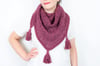 Please note that the tassels featured on the shawl samples are entirely optional for you to make, whether you wish to leave them off because you are running out of yarn at the end of your project, or because you simply prefer how the shawl looks without them. Instructions for how to make a tassel, in the same sizes and for the same yardages as used for the samples, are provided in the pattern.