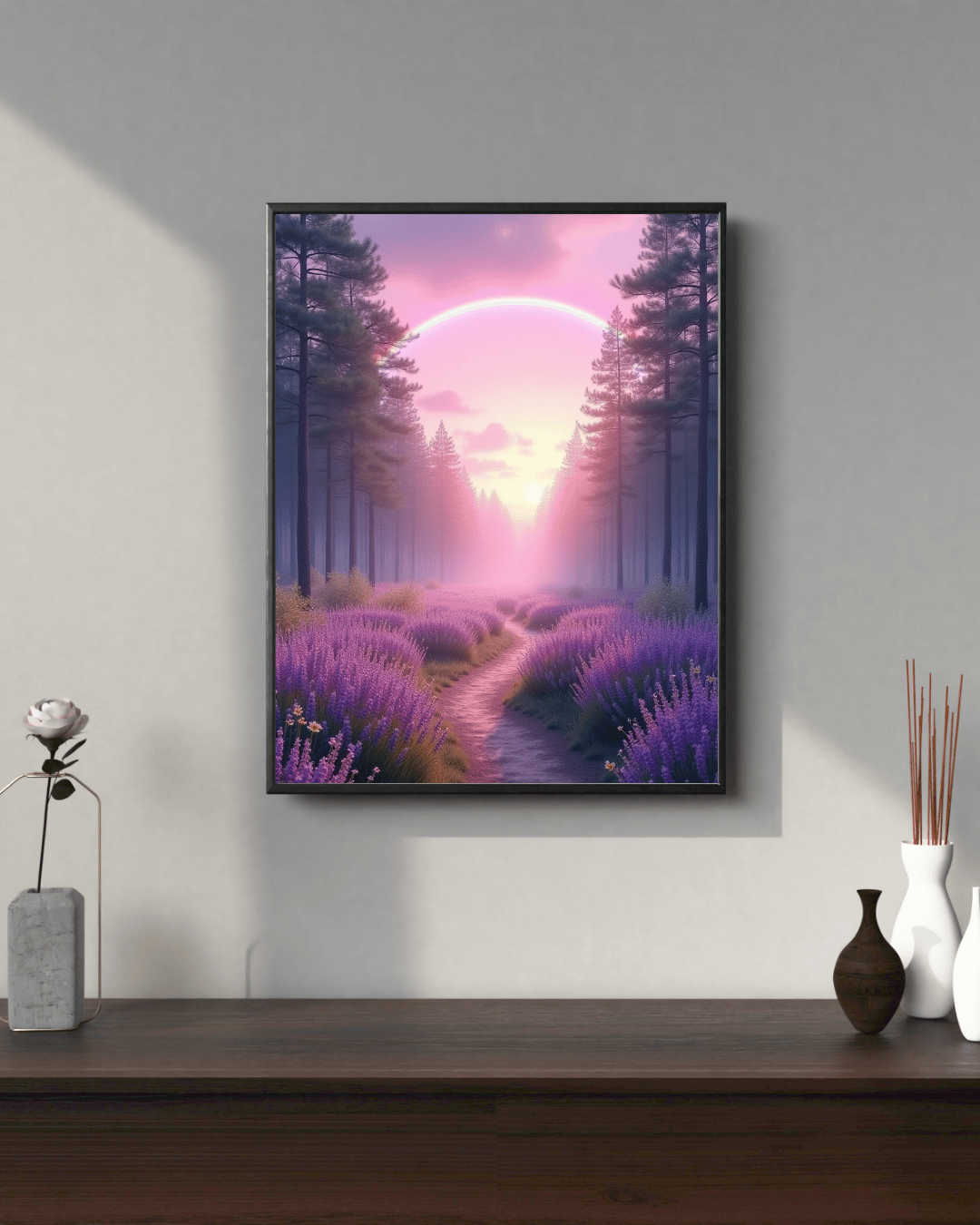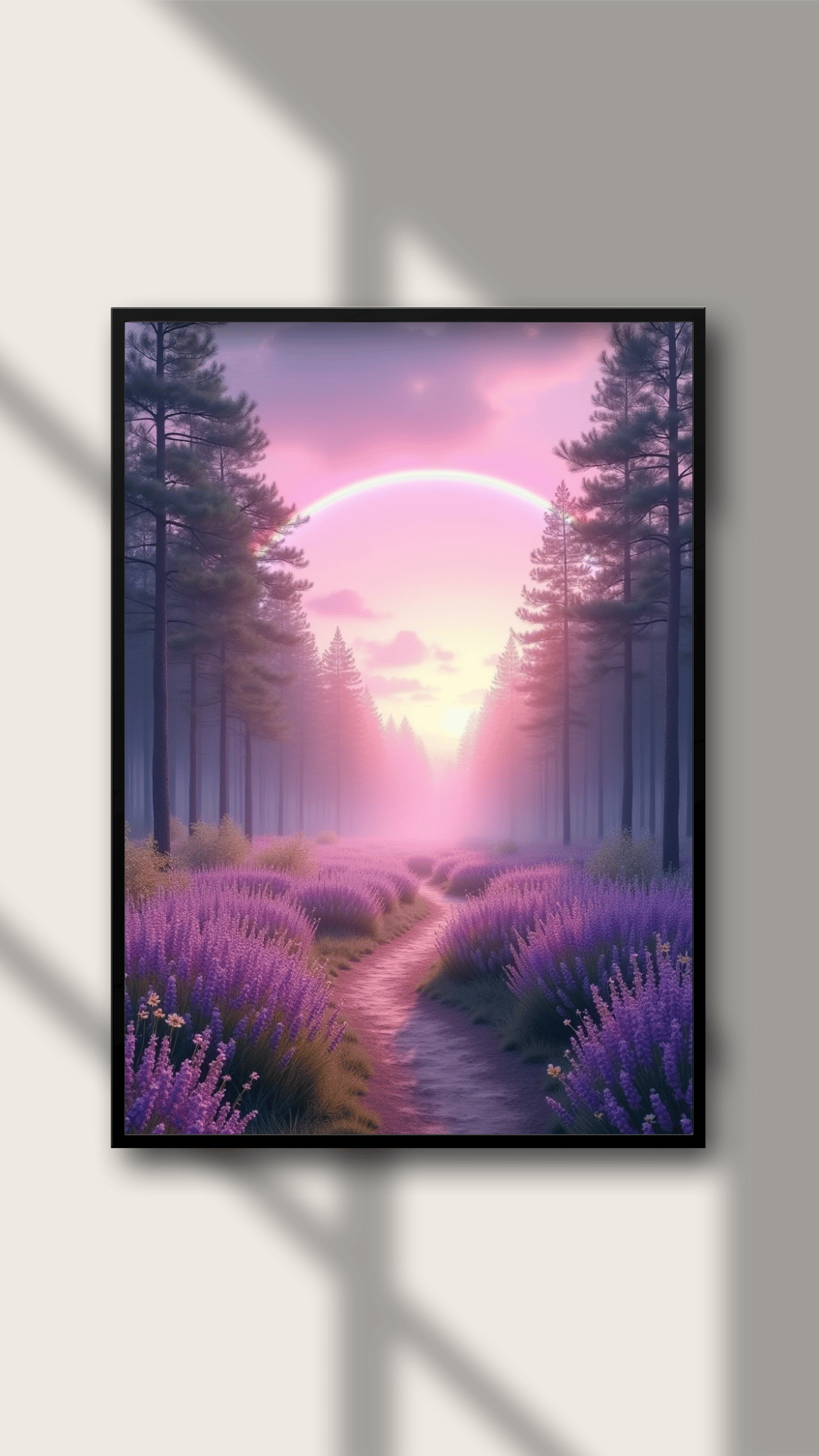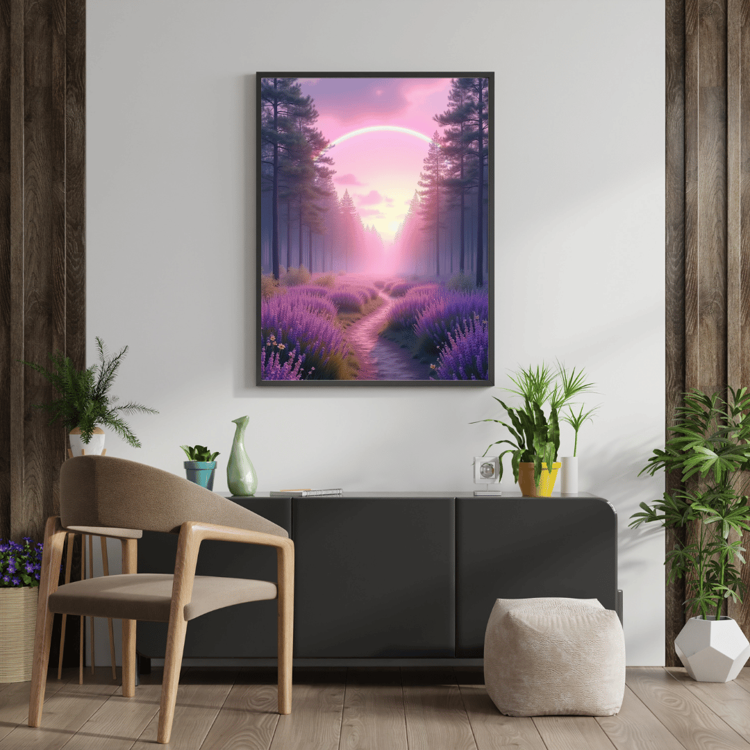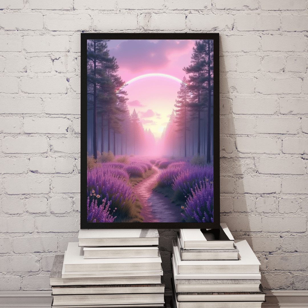 Step into a magical world with this high-resolution digital art piece featuring a serene forest path lined with blooming lavender, glowing under a dreamy pink sunset and a luminous rainbow arch. This artwork blends peaceful nature with a touch of surreal wonder, making it perfect for home décor, wall art prints, digital backgrounds, or mindfulness spaces.