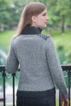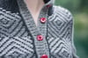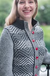 This jacket is worked in separate pieces from the lower edge to the shoulders and sewn together. The fronts are worked in stranded colourwork, with the strands carried across the RS of the work. Fully fashioned shoulder shaping is worked on the back only, so the shoudler seams wrap over the shoulder. The waist is shaped and the jacket has set-in sleeves.