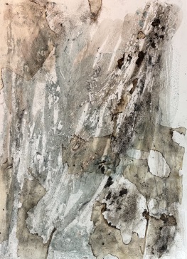 Técnica mixta sobre papel yupo (acuarela, cenizas, bolsas de té de cúrcuma quemadas, cola, pigmentos naturales y collage) Formatos: 32 x 45 cm y 49 x 60 cm.