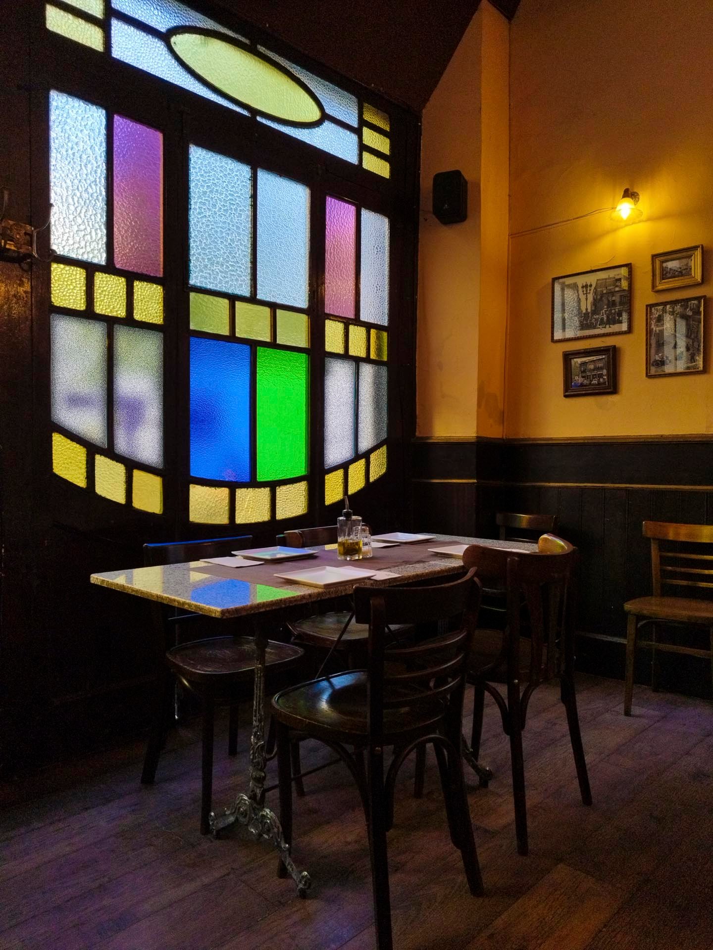 Interior of El Sortidor Restaurant. Stained glass windows.