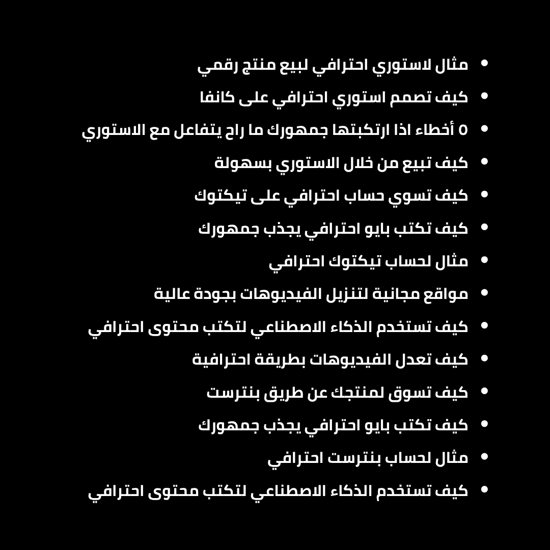 راح تتعلم في الكتاب كل اللي تحتاجه عشان تبني حساب احترافي على التيكتوك او الانستقرام او بنترست وتبدا تبيع منتجات رقمية تربح منها فلوس, من كيفية انشاء المنتجات الرقمية الئ تصميمها بشكل احترافي, الى تصميم المتجر الالكتروني, الى طرق النمو على تيكتوك وانستقرام و بنترست, الى طرق البيع والتسعير الصحيحة, الى طرق مضاعف العملاء و المبيعات, و اكثر من كذا بعد