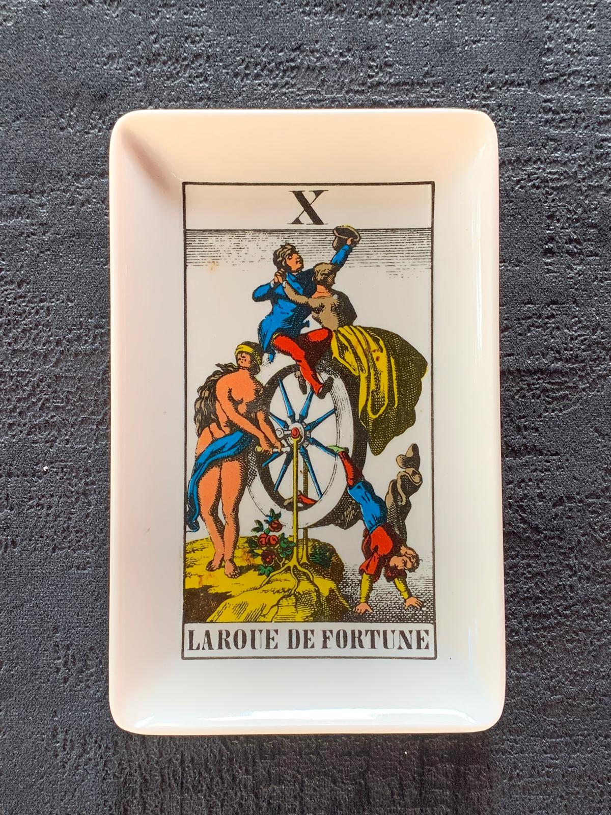 - Piattino con stampa del trionfo "Ruote della Fortuna" prodotto dalla Mebel Italia. Si tratta di un oggetto in melamina, realizzato intorno agli anni '70/'80.