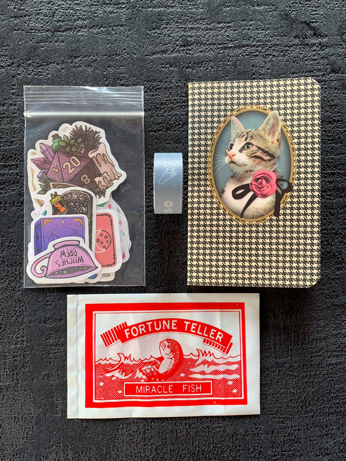 - Omaggi: un sacchetto in velluto stampato per i Tarocchi o gli Oracoli; una candelina nera glitterata; un accendino Clipper con l'Asso di Pentacoli; un rotolo washi tape a tema; un segnalibro; tre carte differenti, di cui una da dipingere; un Fortune Teller Fish; un taccuino per appuntare le divinazioni; stickers a tema.