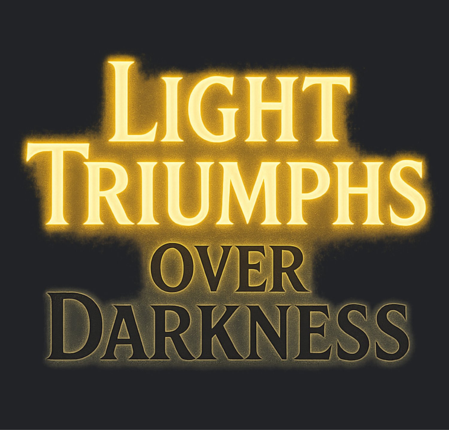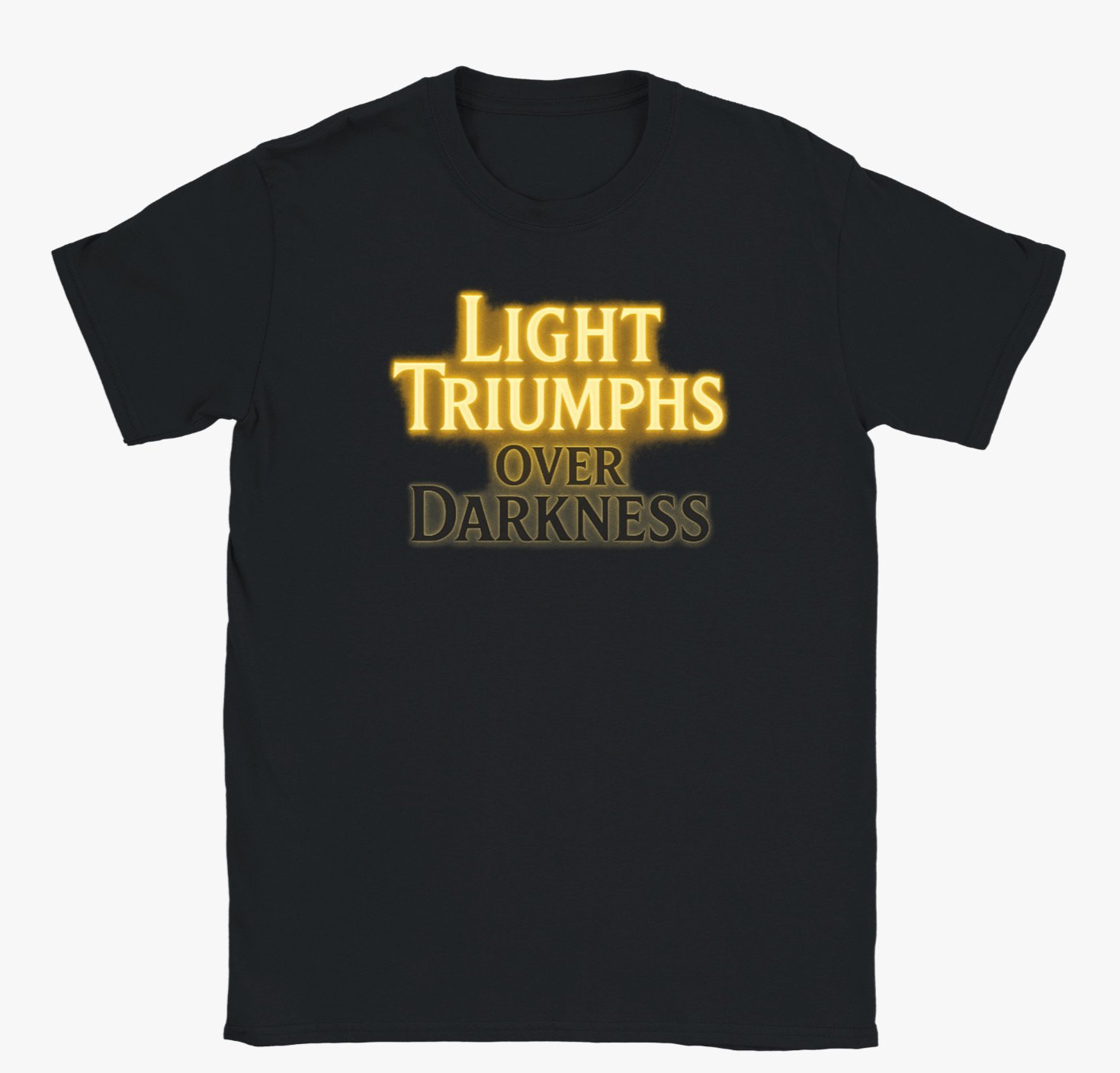 Shine bright and make a statement with this bold “Light Triumphs Over Darkness” t-shirt. Featuring glowing golden text that radiates positivity against a deep black background, this shirt embodies hope, strength, and resilience, perfect for anyone who believes that light always prevails.