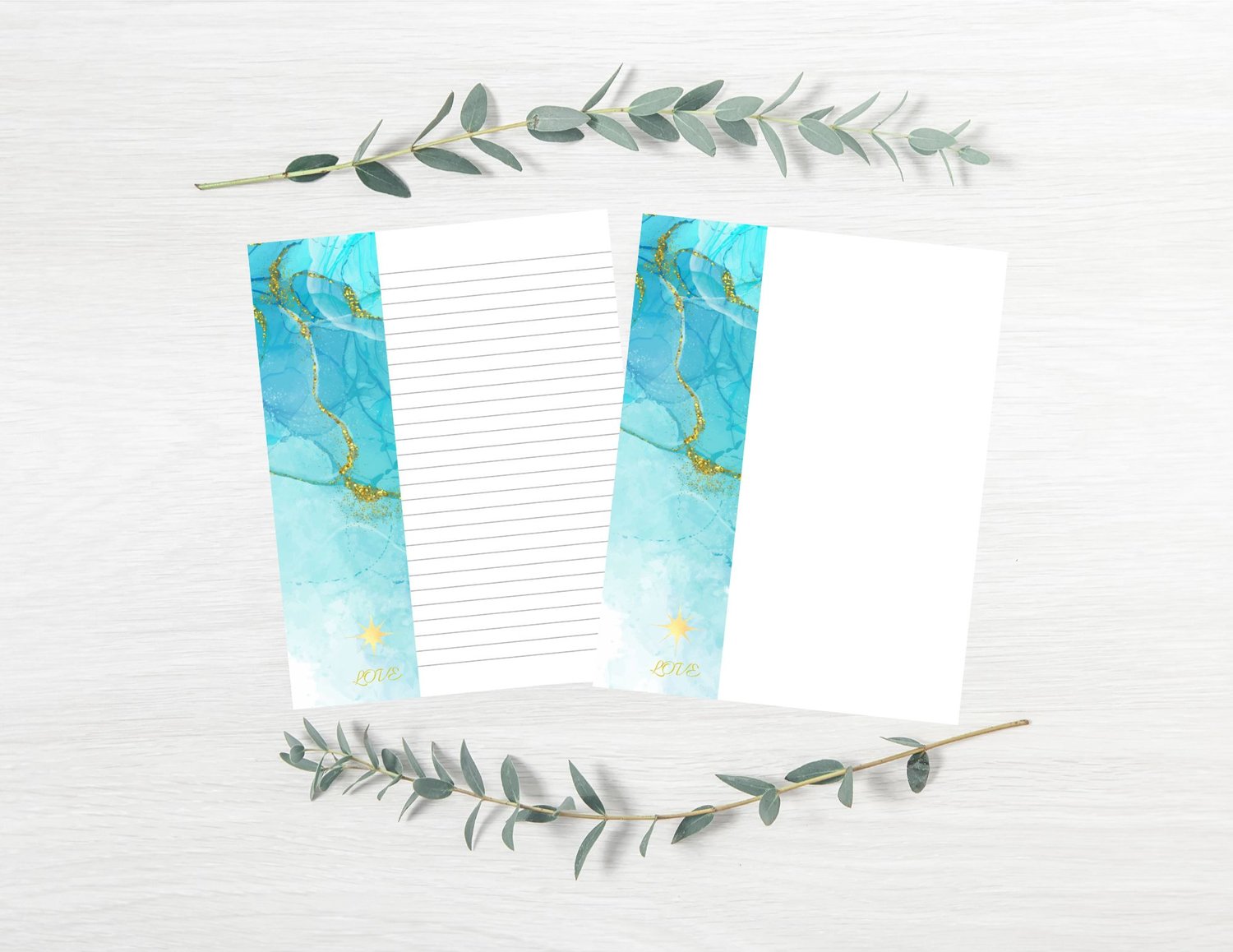 - 4 pages each page has a gorgeous aqua alcohol ink background with a golden star and the words love written on each page.