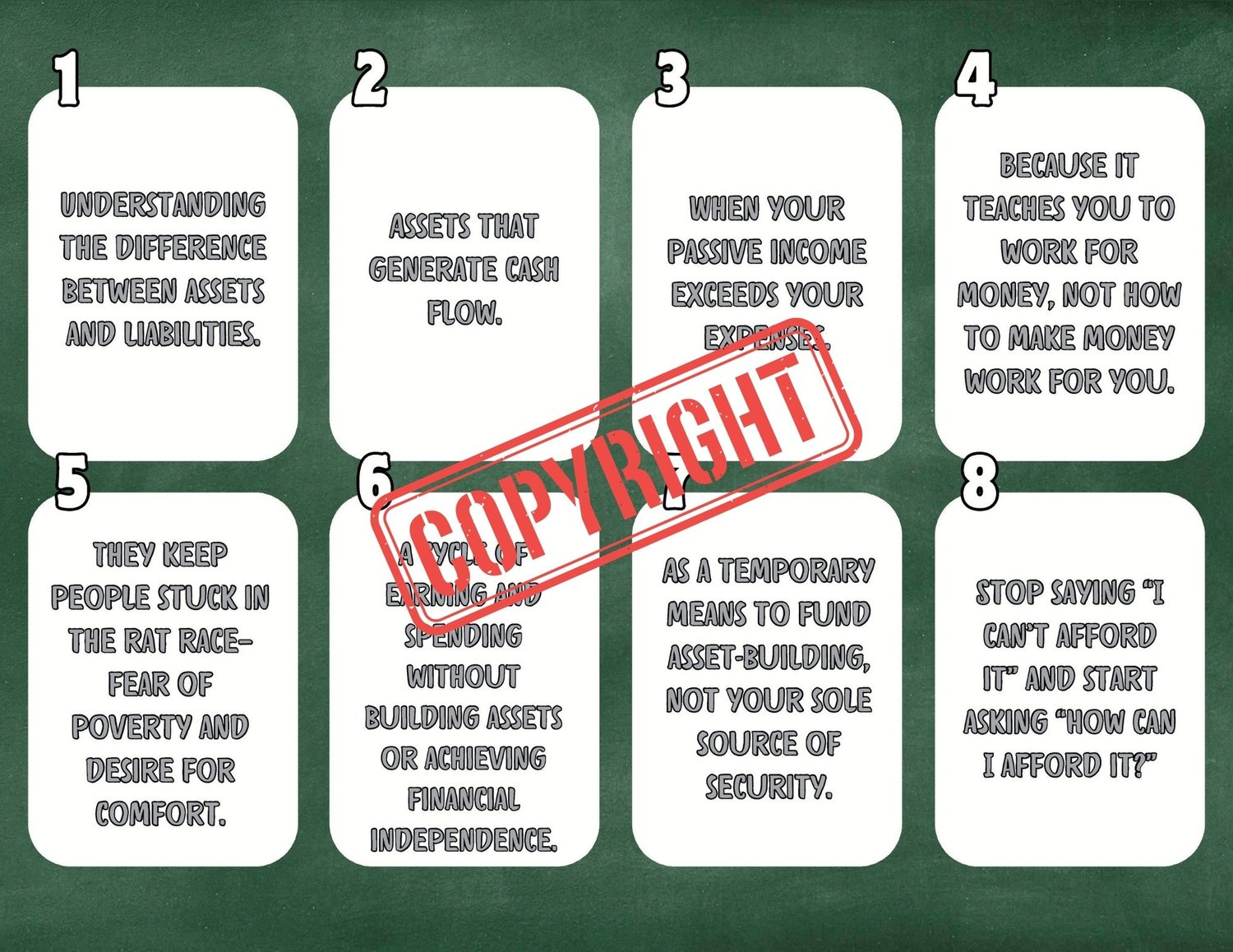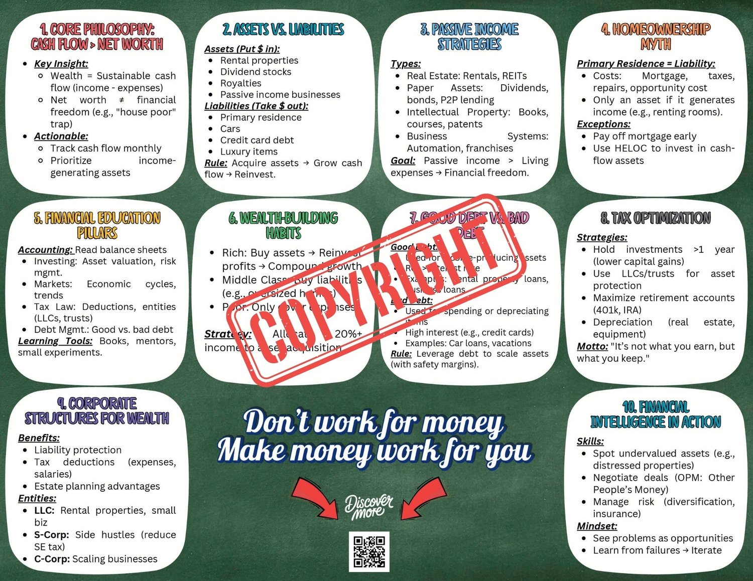 This isn’t just a book summary. It’s a practical system designed to help you apply Robert Kiyosaki’s most powerful money lessons and shift the way you think about wealth, work, and freedom.