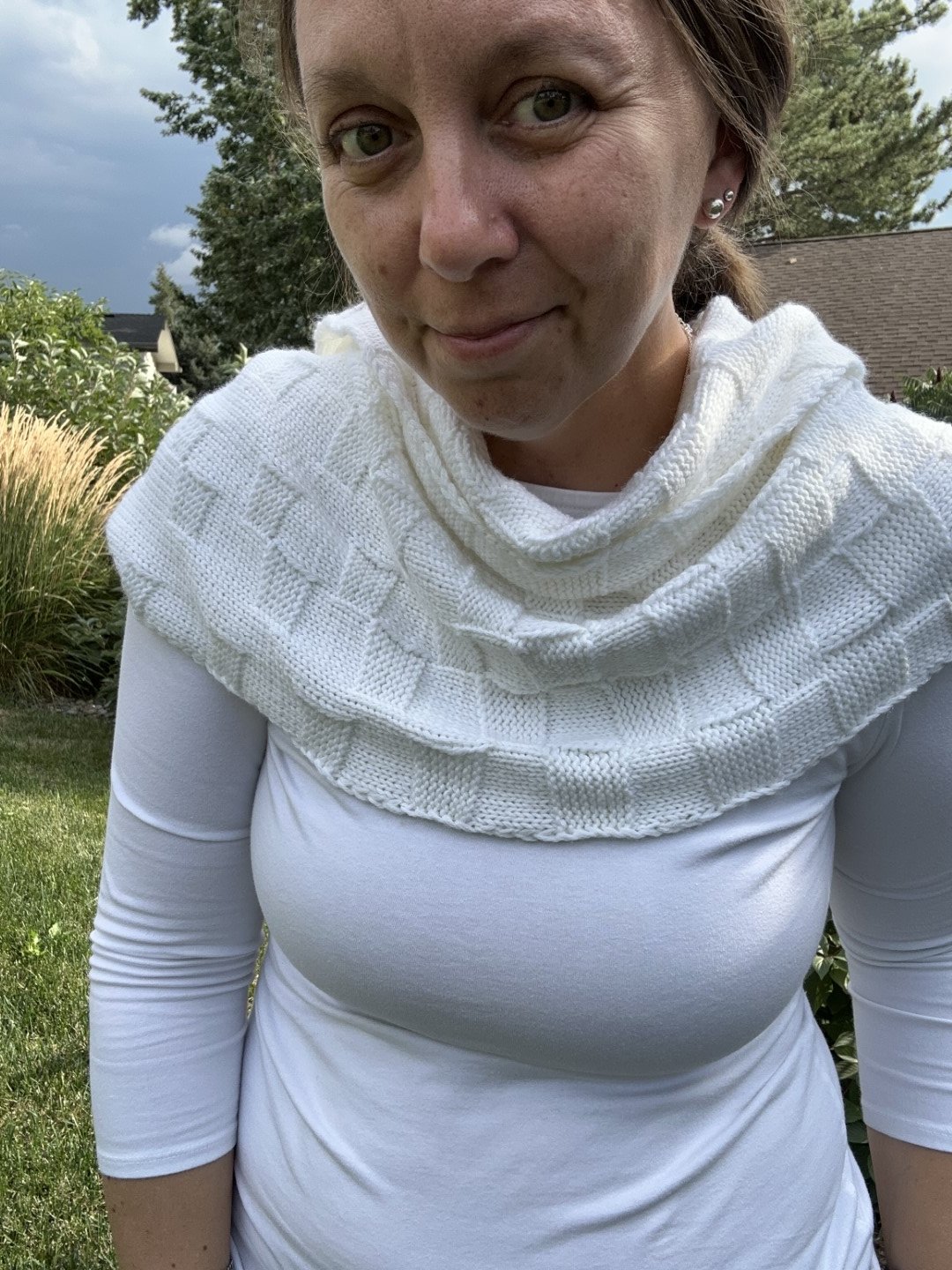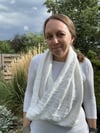 Throughout my adult life, I’ve made notice of various annual milestones, pausing a moment to remember my last experience and reflecting on my current feelings. I’ve reflected on annual events such as gatherings with friends, 5K races, and, most notably, holidays. I sing in the choir at my Temple for the Jewish High Holidays. We ramp up our practice in the late summer and sing our program of songs during services, many of which are repeats from previous seasons with a few new pieces peppered in. We rejoice and repent and reflect, and it is our tradition to wear white for one day of our services. Return Again is a recurring phrase in the liturgy and song. I interpret this to feel welcomed back to be myself in this time of ritual and reflection. A chance to try my best for another season of being me. The design for RETURN AGAIN COWL captures a year of slow, sometimes imperceptible change punctuated by the reality that the year is in fact starting again. This design captures my yearly experience of moving through time, then confronted with the slightly abrupt reset, regroup, and return.