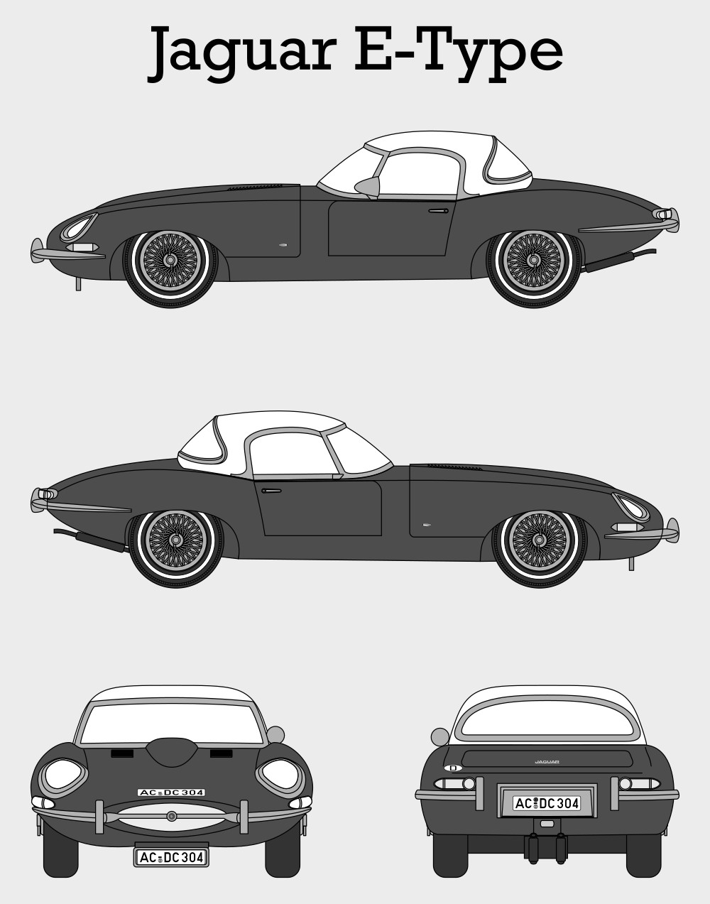 Jaguar E-Type Car Blueprint PDF SVG Vector Drawing.