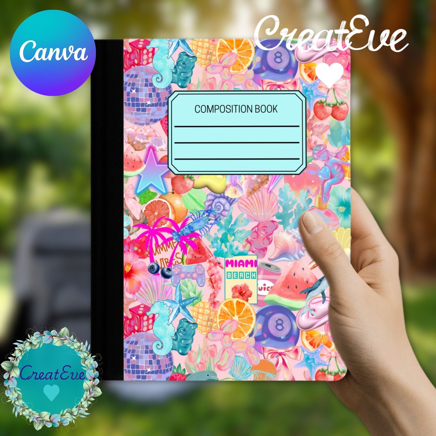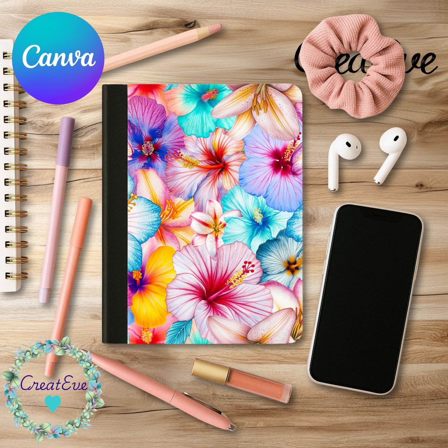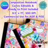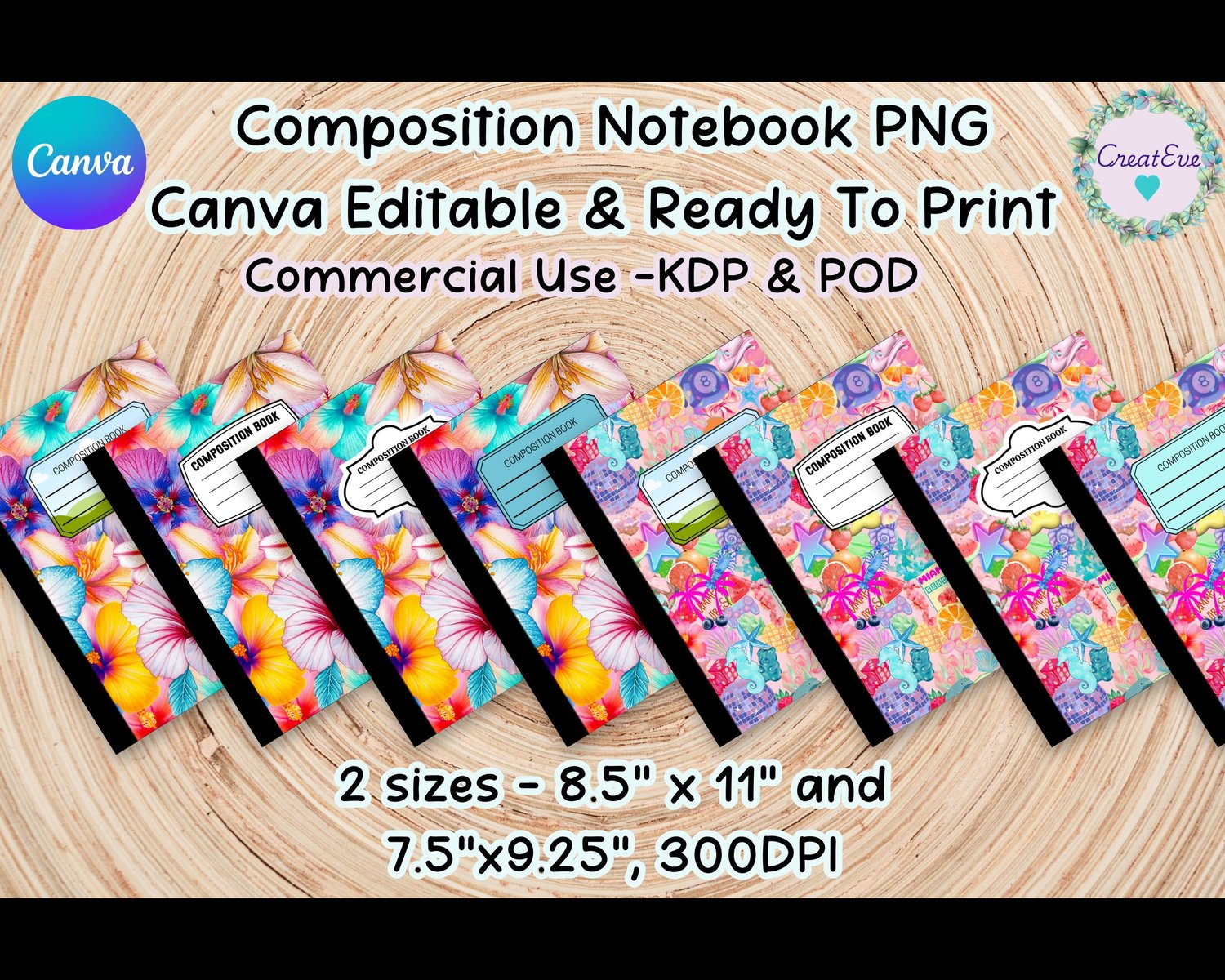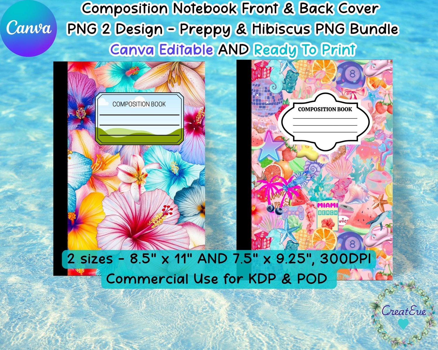 Preppy & Hibiscus Composition Notebook 2 Designs PNG Bundle Canva Editable AND Ready to Print,Commercial KDP Included