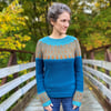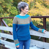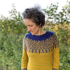 Blue Spruce is a top down, long-sleeved pullover with fair isle patterning along the yoke and sleeves. Options for altering the sleeve length and body shape are included within the pattern.