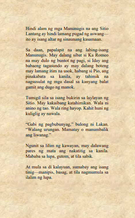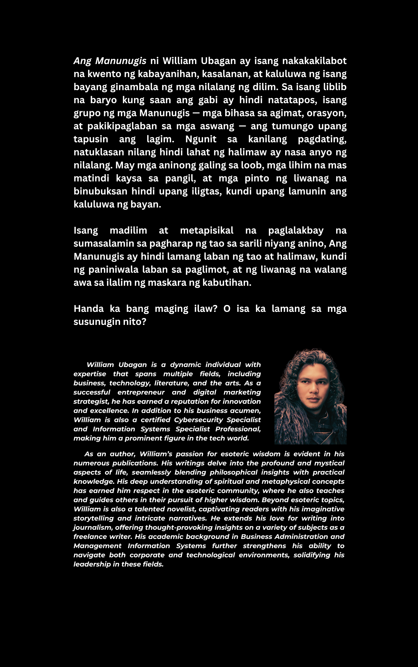 Ang Manunugis ni William Ubagan ay isang nakakakilabot na kwento ng kabayanihan, kasalanan, at kaluluwa ng isang bayang ginambala ng mga nilalang ng dilim. Sa isang liblib na baryo kung saan ang gabi ay hindi natatapos, isang grupo ng mga Manunugis — mga bihasa sa agimat, orasyon, at pakikipaglaban sa mga aswang — ang tumungo upang tapusin ang lagim. Ngunit sa kanilang pagdating, natuklasan nilang hindi lahat ng halimaw ay nasa anyo ng nilalang. May mga aninong galing sa loob, mga lihim na mas matindi kaysa sa pangil, at mga pinto ng liwanag na binubuksan hindi upang iligtas, kundi upang lamunin ang kaluluwa ng bayan.