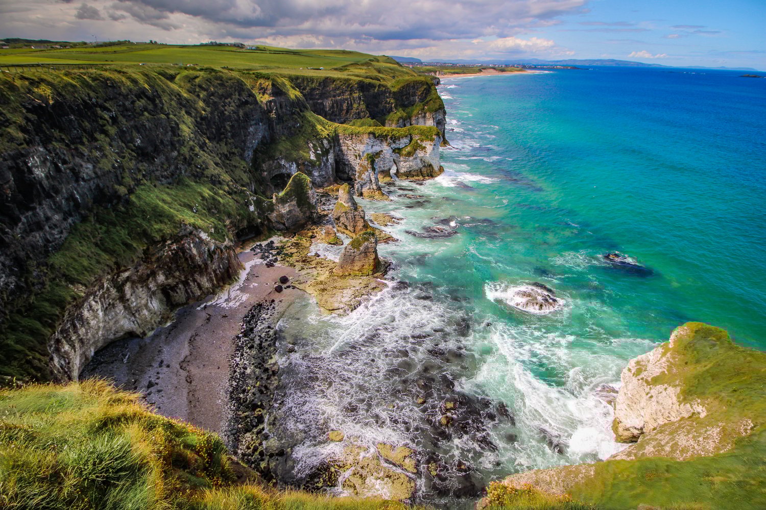 This wider view captures the rugged edge of the Atlantic as it meets Northern Ireland’s north coast, with waves breaking against rock stacks and hidden coves below. The scene feels wild yet balanced, shaped by constant motion over time.