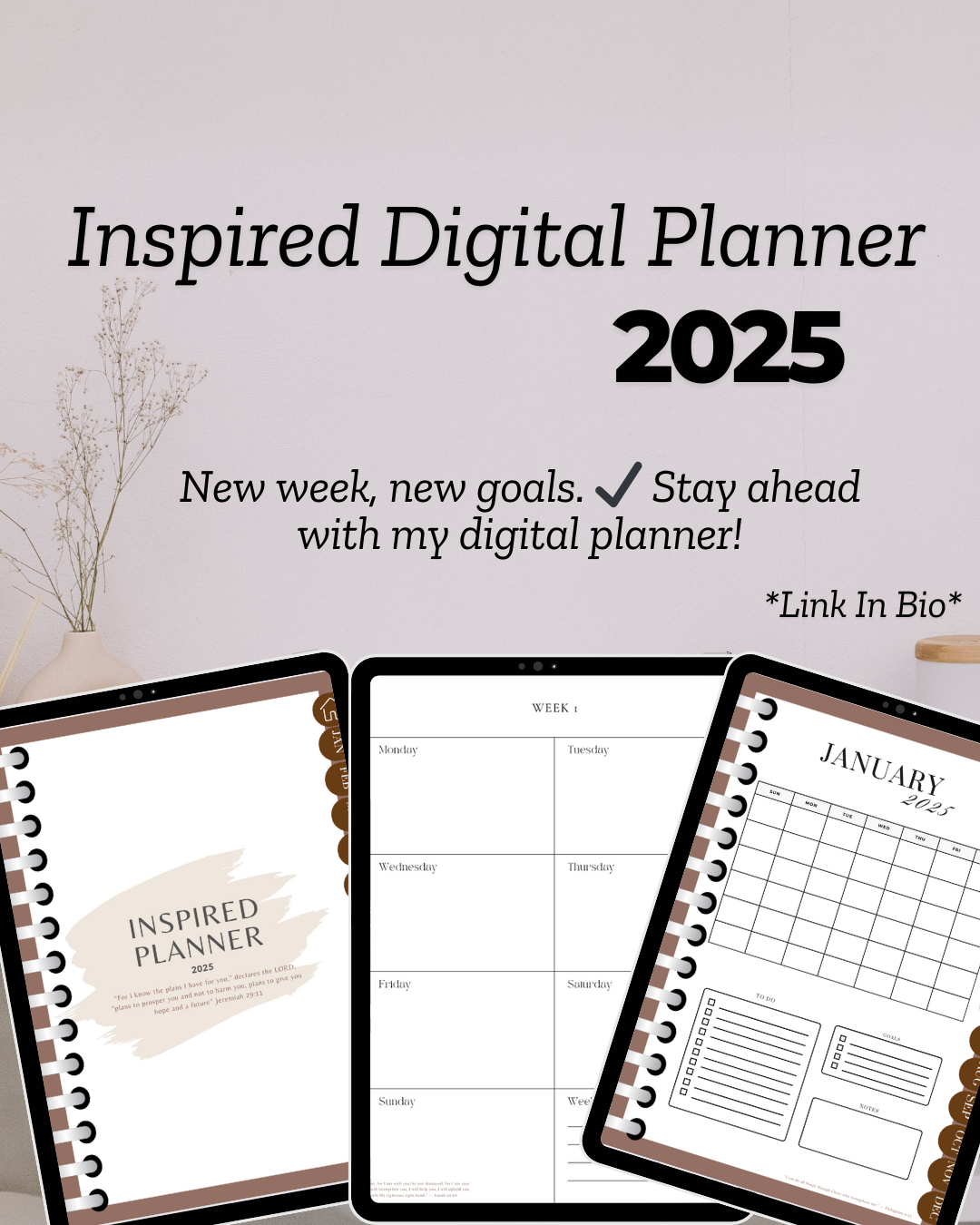 Step into 2025 with intention and inspiration! The Inspired Planner 2025 is designed to help you stay organized, focused, and grounded in faith. Each page features a carefully selected Bible verse to encourage and uplift you throughout the year. Whether you’re planning your daily tasks, setting goals, or reflecting on your journey, this planner will keep you aligned with your purpose.