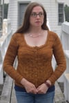 And so begins the extraordinary fate of Miss Marianne Dashwood. What better attire for our heroine than an Empire-waist cardigan with an intriguing cabled lace skirt and picot edging around the mitered neckline. Stockinette-stitch panels at the side make waist shaping easy, and the garter-stitch hem, cuffs, and integrated button band give a clean finish, allowing the picots to draw attention upward to your pretty face.