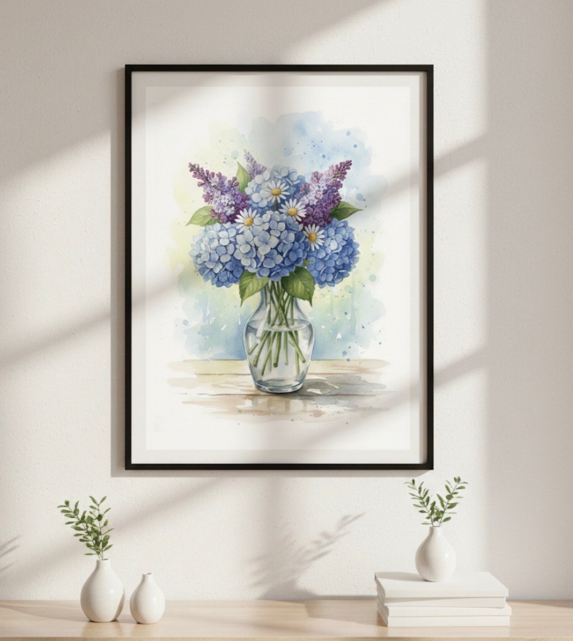 This is a high-quality digital download featuring a beautiful watercolor bouquet of Blue Hydrangeas and Lilacs. Perfect for home decor, office styling, or as a thoughtful gift.
