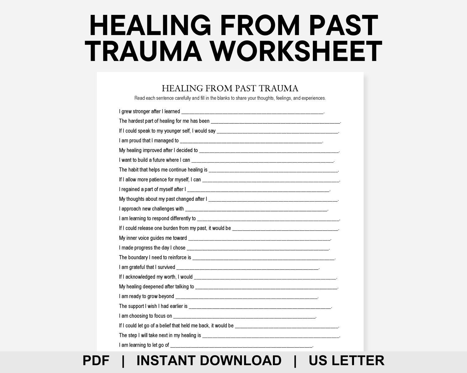Be kind to yourself—you deserve it! This Healing From Past Trauma worksheet features 30 prompts to help you process difficult emotions and take the next step in your recovery. Use it for therapy sessions, journaling, or self-reflection to understand your triggers, develop healthy coping mechanisms, and plan actionable steps forward. Remember, your healing journey is uniquely yours.
