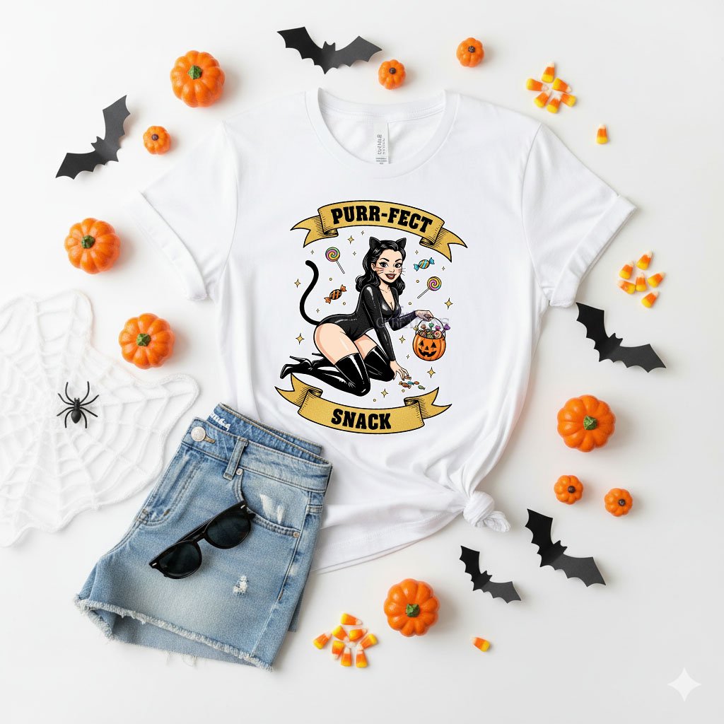 The purr-fect fit 🐾 The Cat Snack shirt features a sleek pin-up in a cat costume with the golden banner “PURR-FECT SNACK.” Ideal for cat lovers and Halloween queens alike.