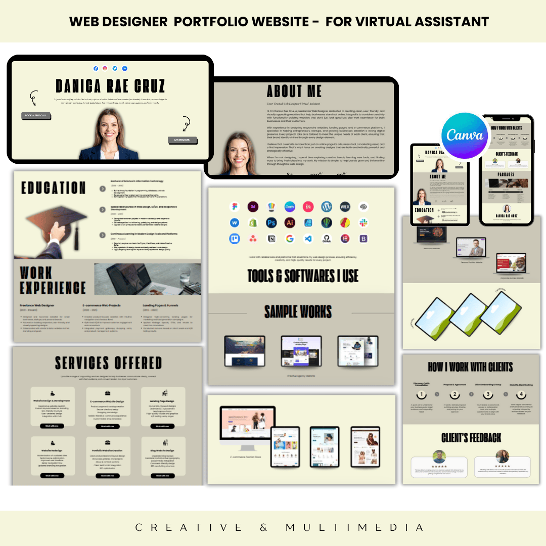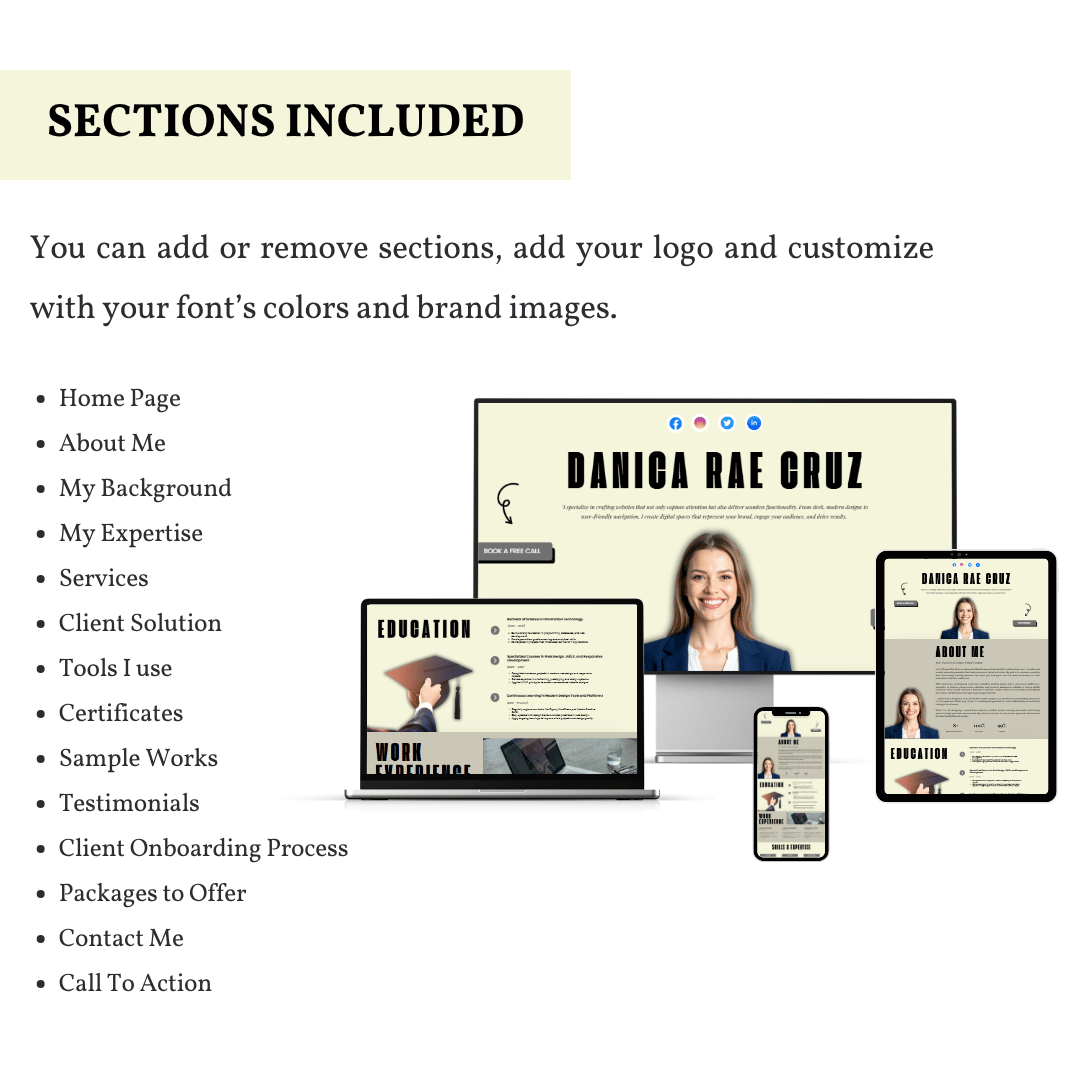 đŸ”¹ Pages: Home, About, Education, Work Experience, Services, Skills & Expertise, Tools, Work Samples, Packages, Certifications, Onboarding Process, Testimonials, Client Solution, Contact CTA.