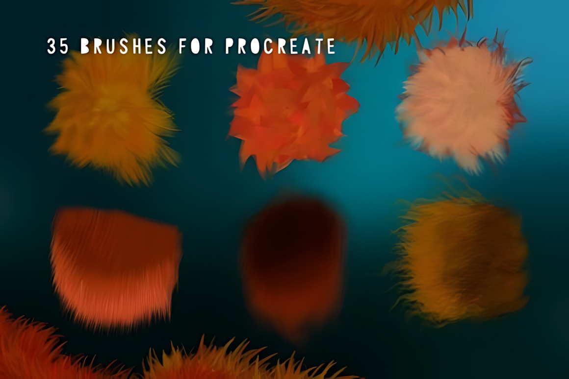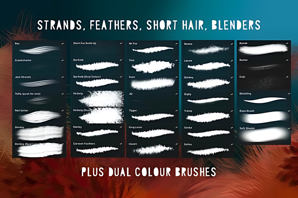 35 brushes fill this collection each shaped for fur, feathers, or flowing hair in Procreate.