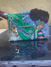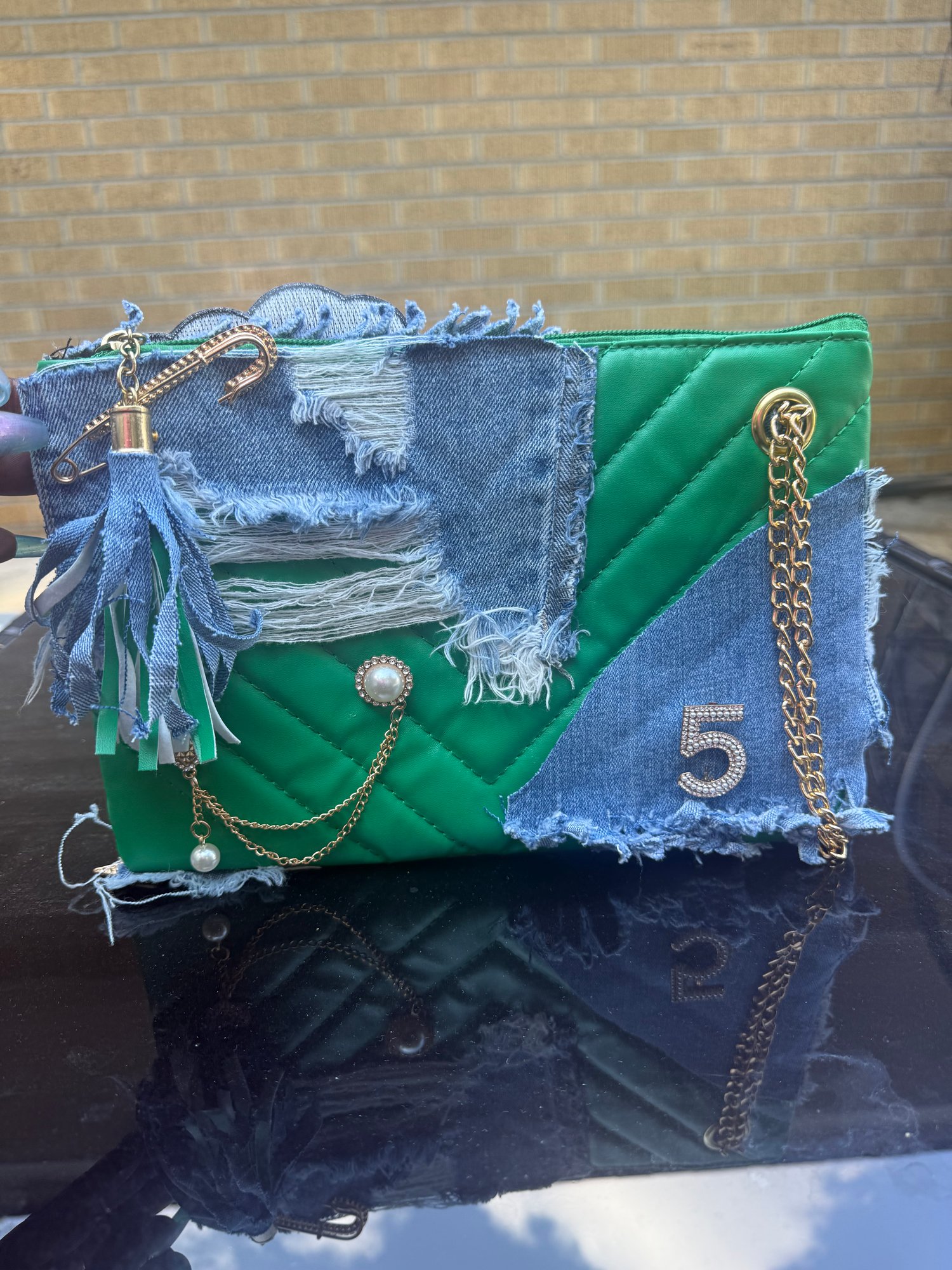 Step into the spotlight with this custom green-and-denim art couture purse, where fashion collides with empowerment. The front features a bold embroidered portrait of a vibrant Black queen crowned in color, framed with distressed denim, rhinestone blooms, and a golden “Faith” script that reminds you of your unbreakable spirit. A sculpted gold mask and jeweled crown accent add mystery and royalty, while every chain and sequin whispers: you’re untouchable.