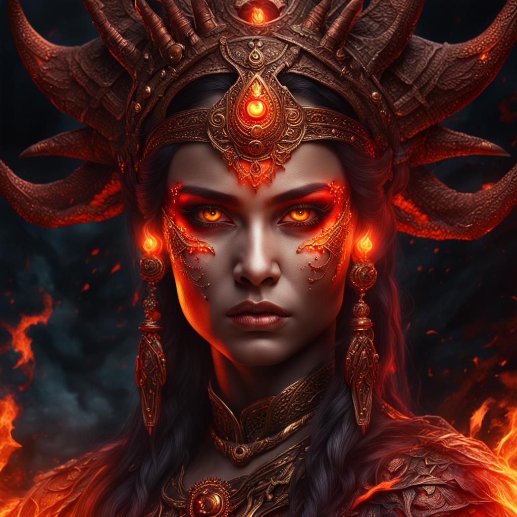 Product Description: Unleash the fiery power of the "Majestic Fire Sorceress Queen," a photorealistic digital portrait capturing the intense gaze and commanding presence of a sorceress queen in the Inferno Temple. With glowing red eyes and regal attire, she exudes majesty and raw power.