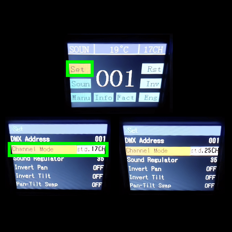 * Verifique, desde el display del equipo, que el menú "Set / Channel Mode" muestre los modos: 17CH y 25CH (tercer foto).