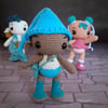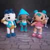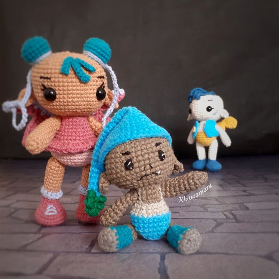 Guía de tejido virtual descargable (archivo PDF) para elaborar paso a paso estos 3 muñecos de la colección Sakranaka. Incluye instrucciones detalladas y 100 fotos para guiarte.