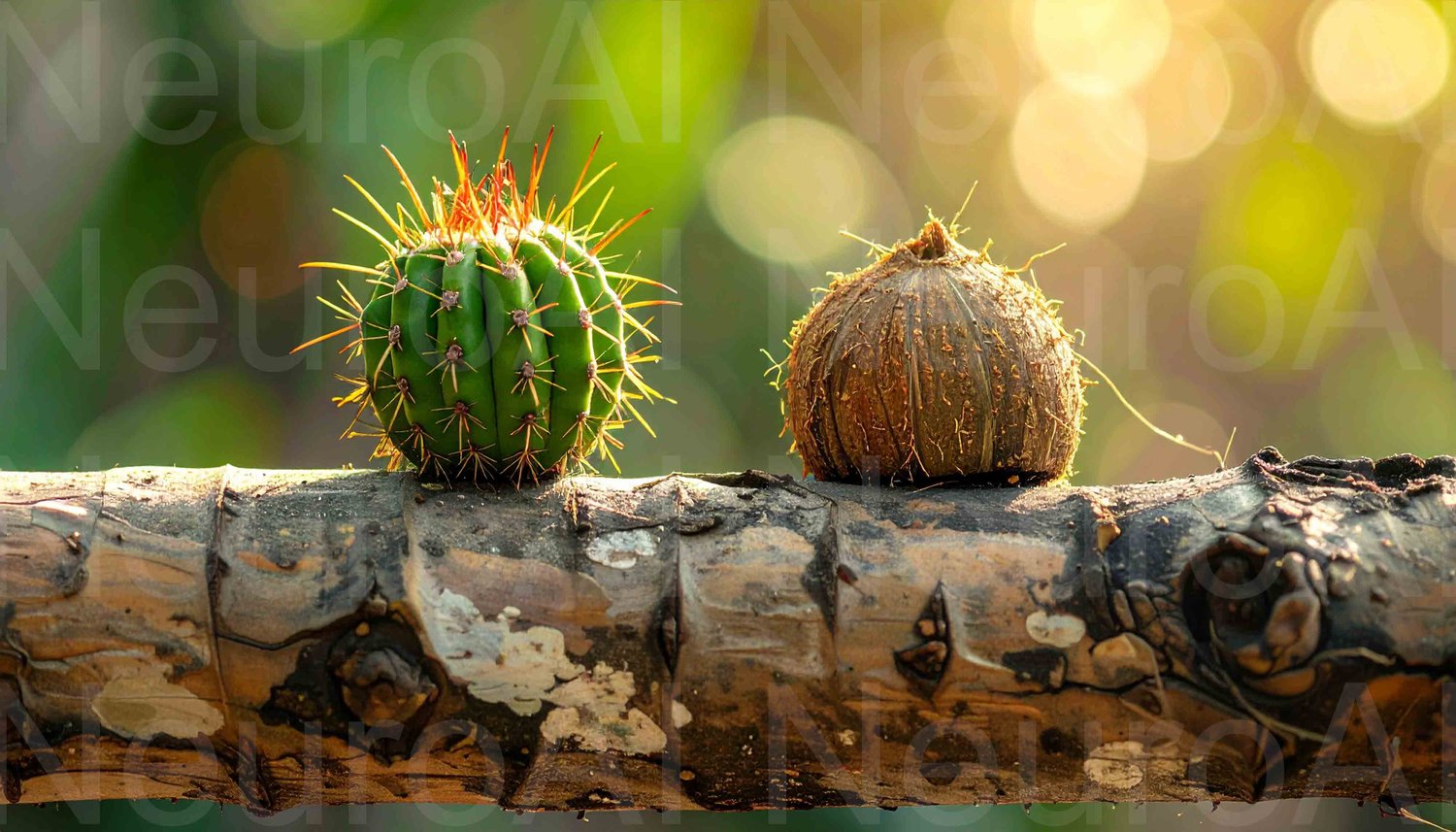Stunning cactus and coconut on weathered tree branch