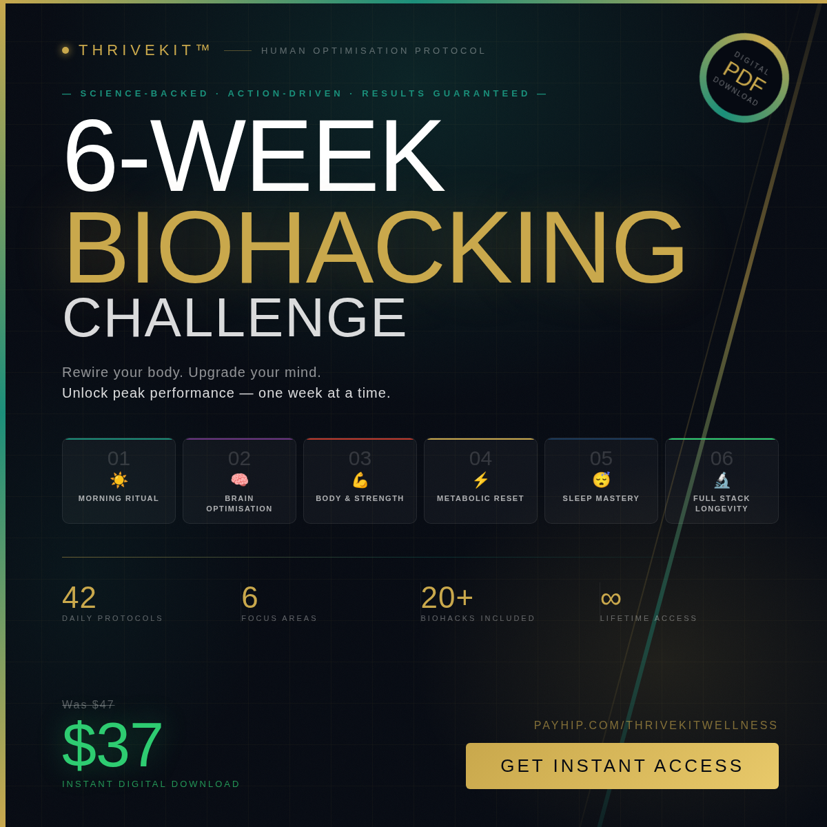 The ThriveKit™ 6-Week Biohacking Challenge is a structured, science-backed, week-by-week protocol that stacks high-impact habits to systematically upgrade your brain, body, hormones, metabolism, sleep, and longevity — all in one complete digital programme.