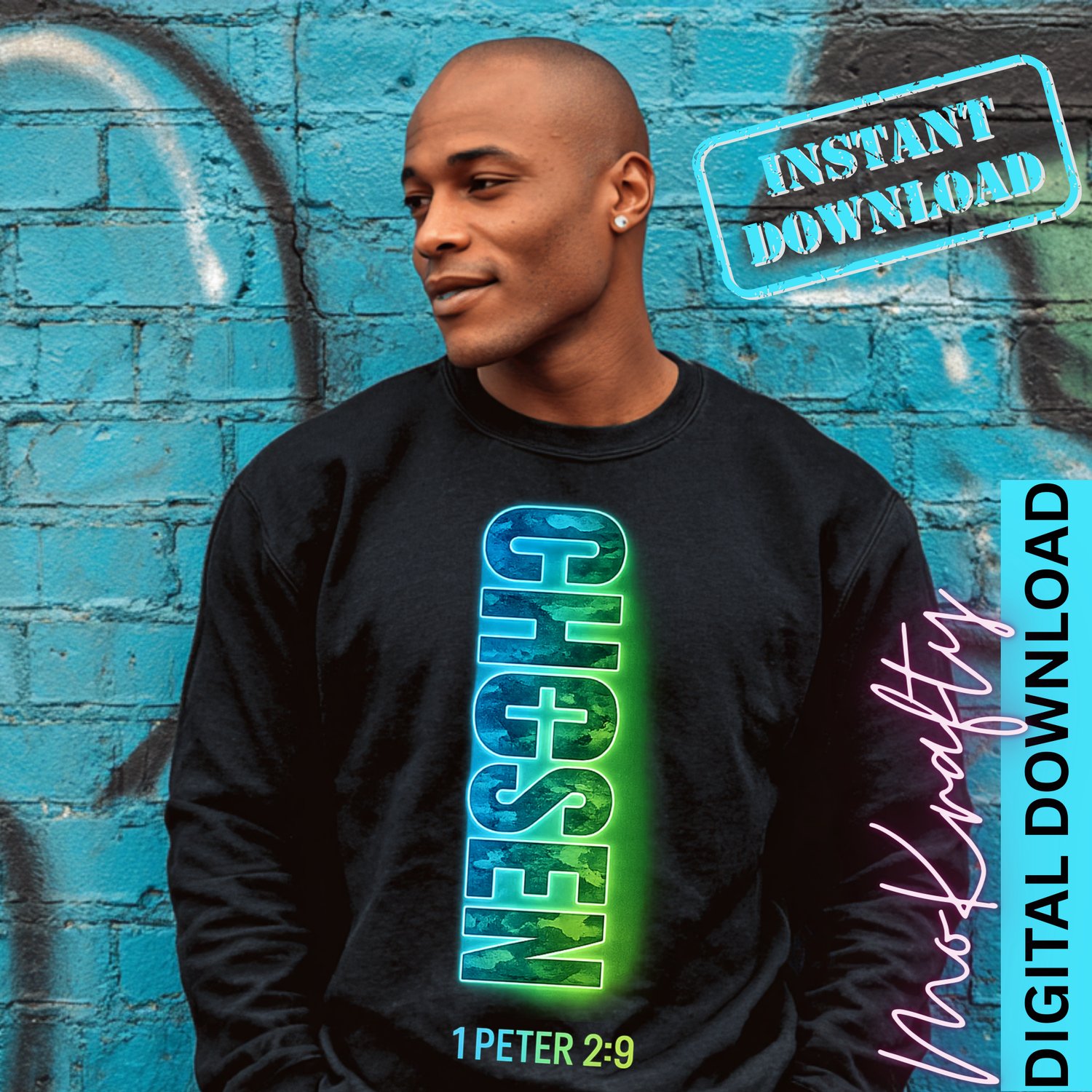 Bring bold faith to fashion with this "Chosen - 1 Peter 2:9" Christian PNG design. Perfect for men's sweatshirts or tees, this powerful vertical graphic with cross detail makes a striking statement of identity and purpose. Ideal for those who wear their beliefs with pride, this digital file is great for crafting standout DTF prints or sublimation projects.