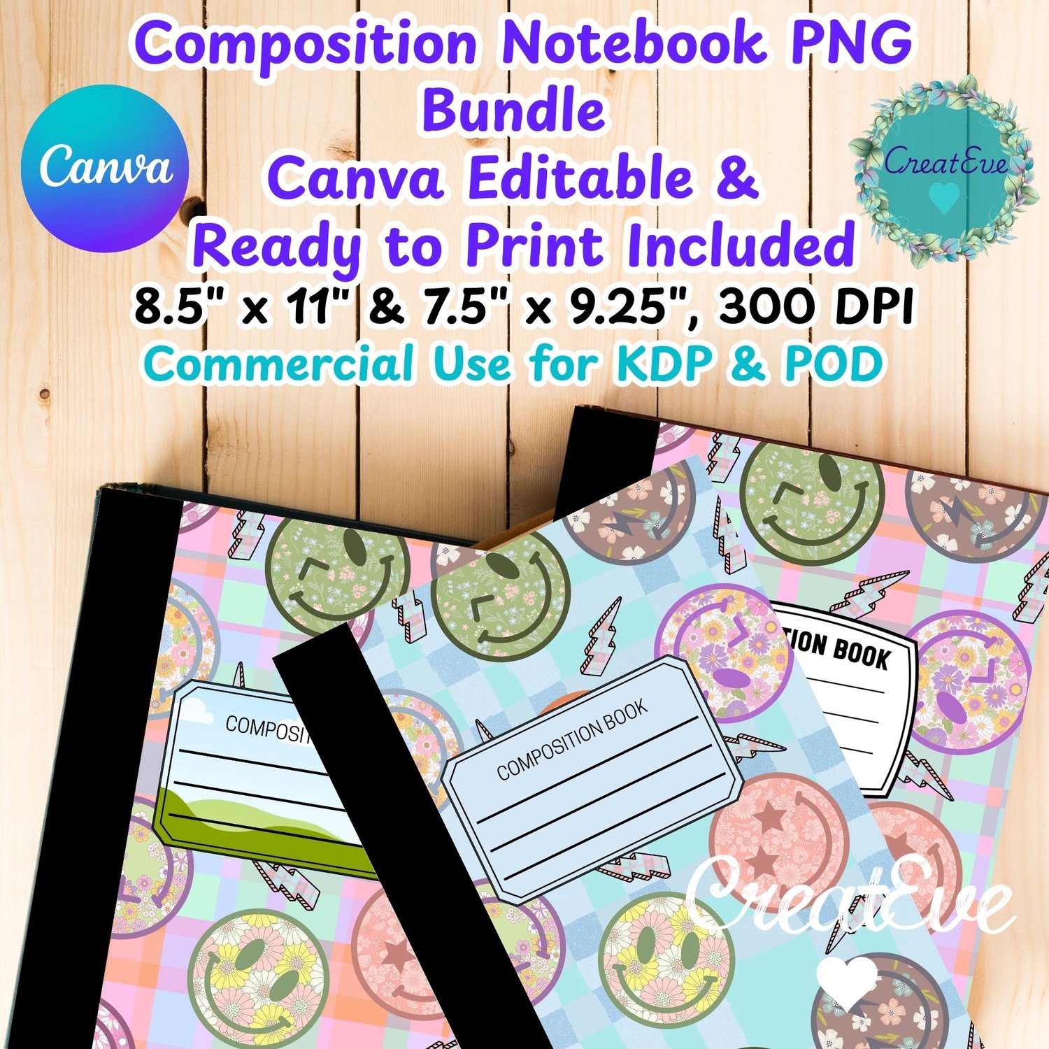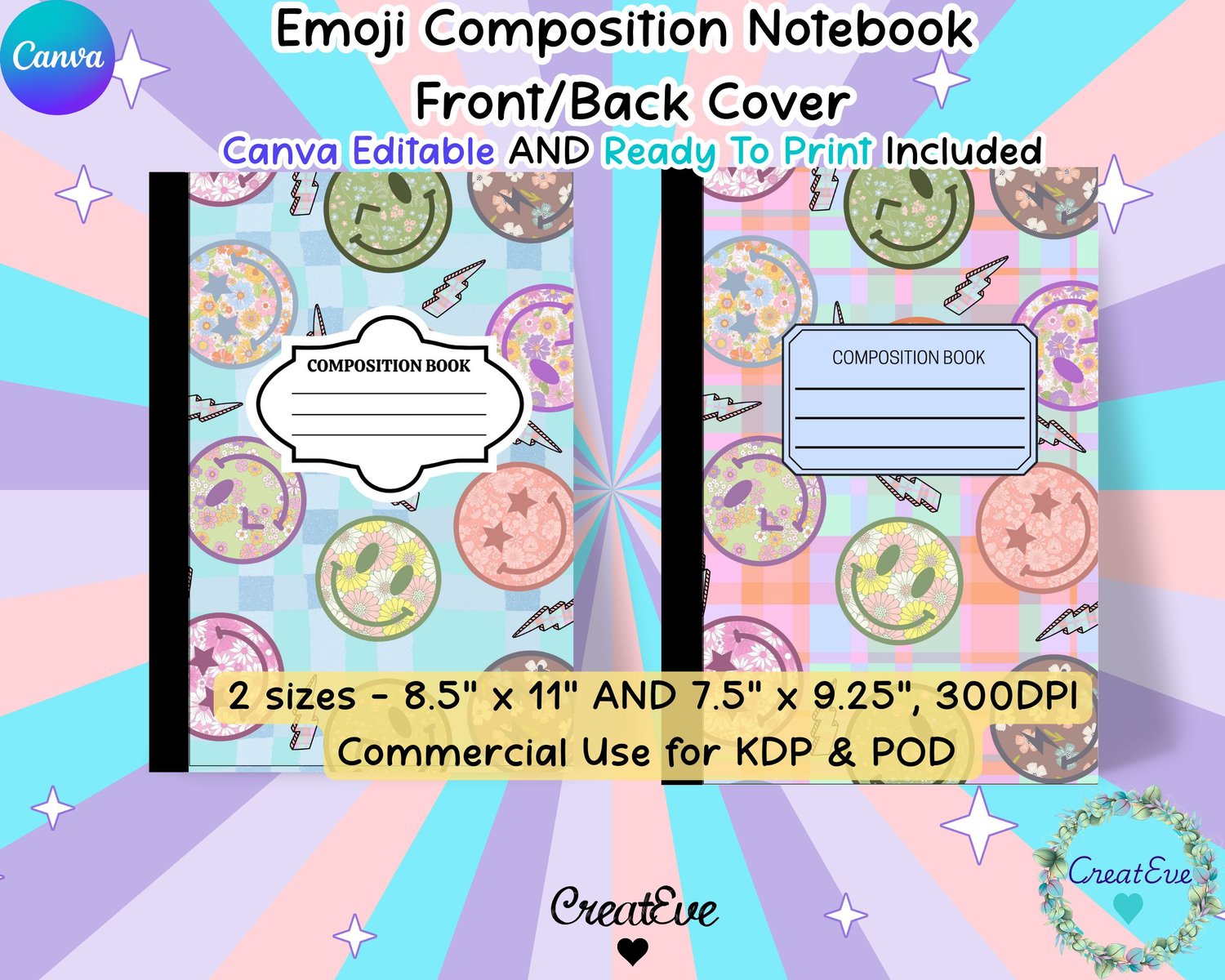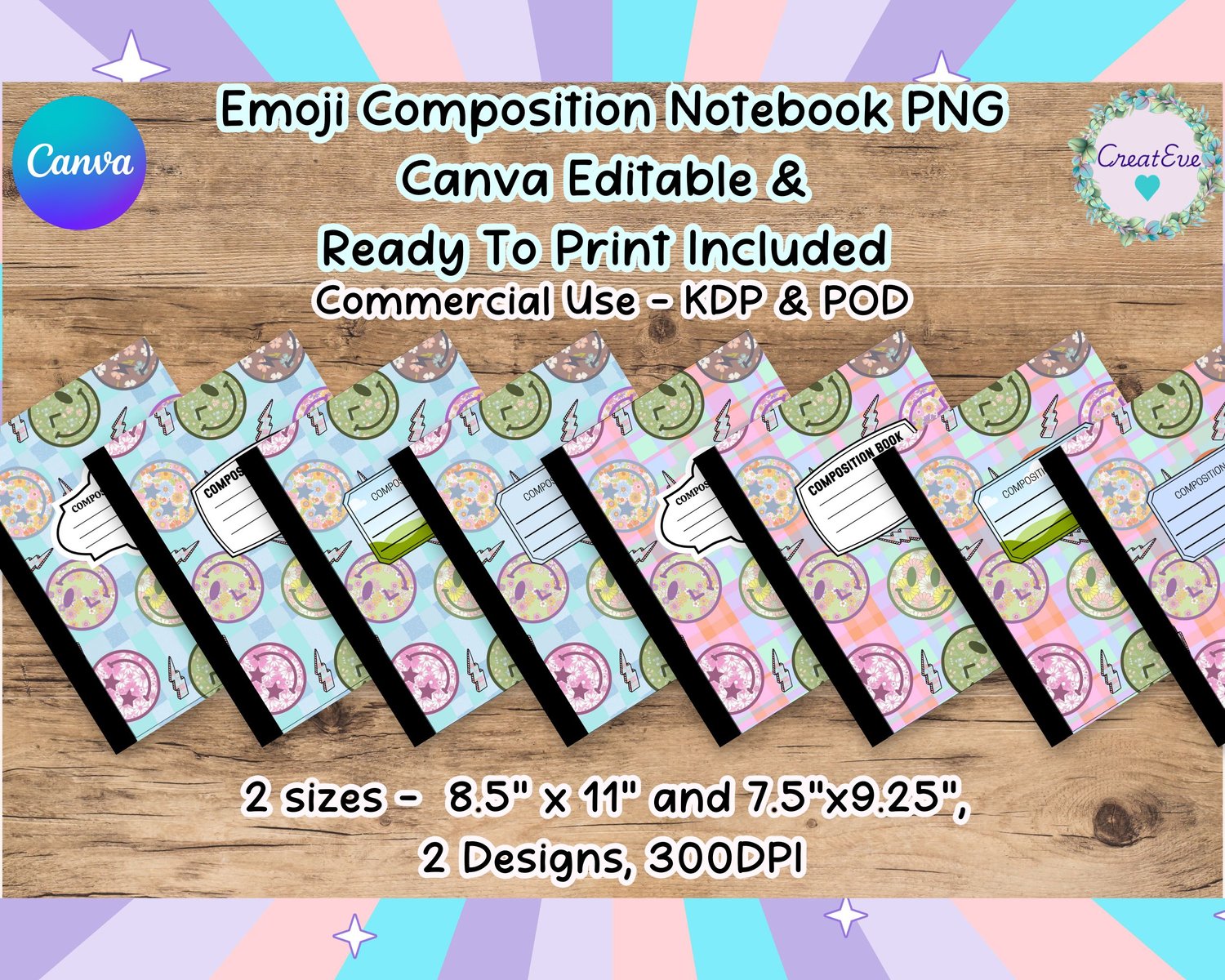 Retro Emoji Composition Notebook Canva Editable & Ready To Print 2 Background PNG Bundle
