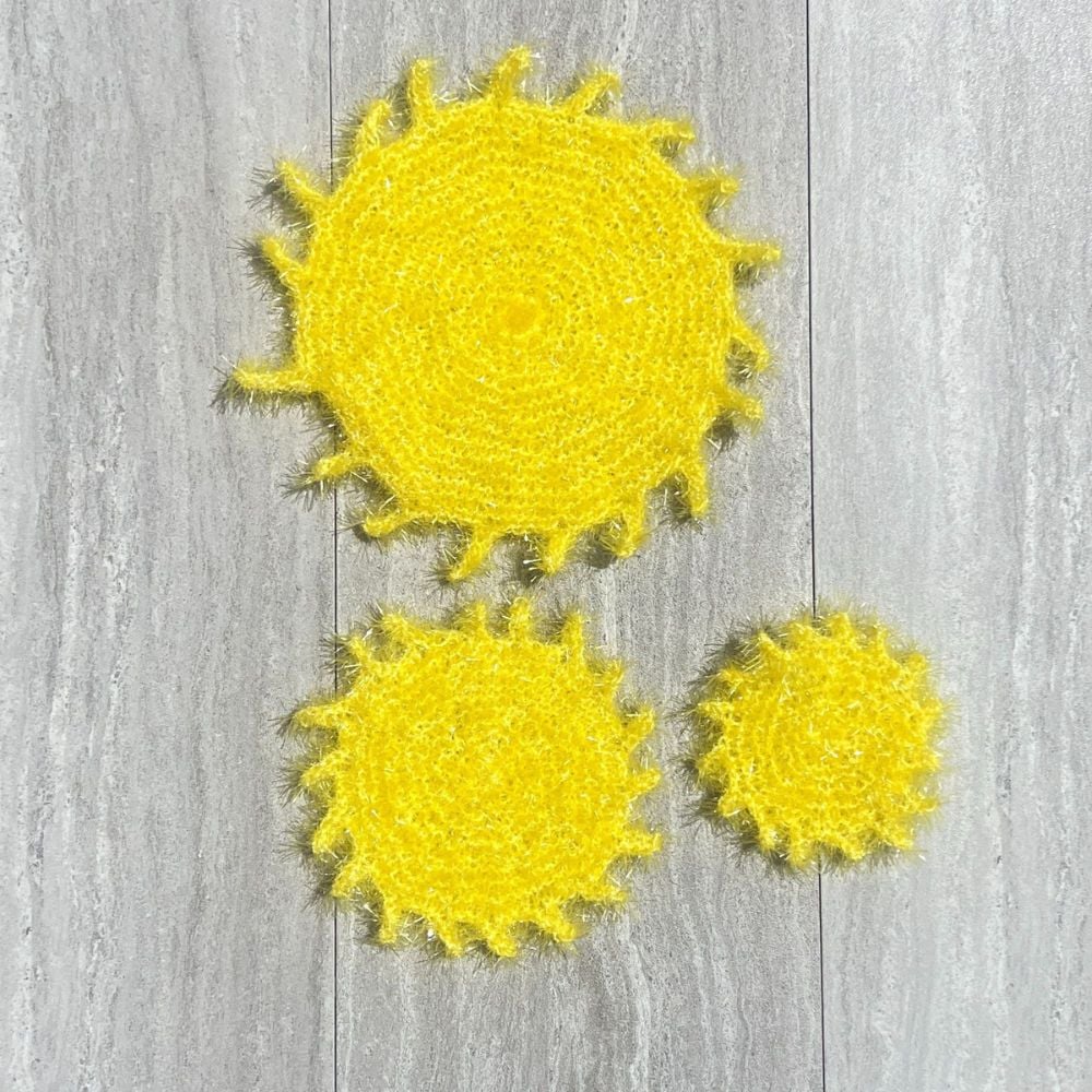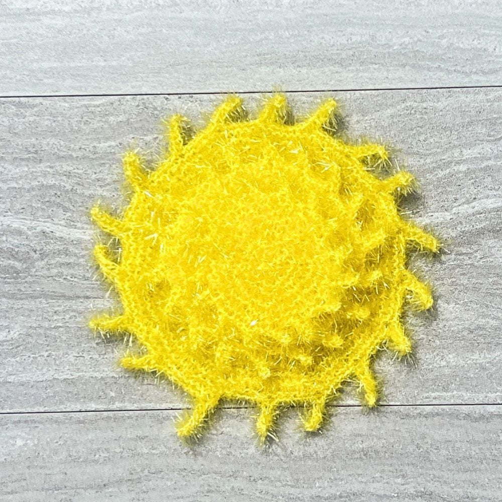 Scrubbin’ on Sunshine is knit in the round using garter stitch. With regular increases, your sunshine will grow from the center out. Finally, those beautiful rays are a whimsical picot bind-off.