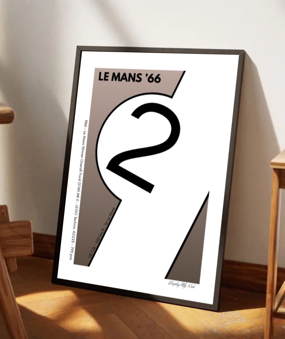 Cette affiche s’inspire directement de la victoire mythique de Ford aux 24 Heures du Mans 1966, avec un design graphique fort autour du numéro 2, emblématique de la voiture gagnante.