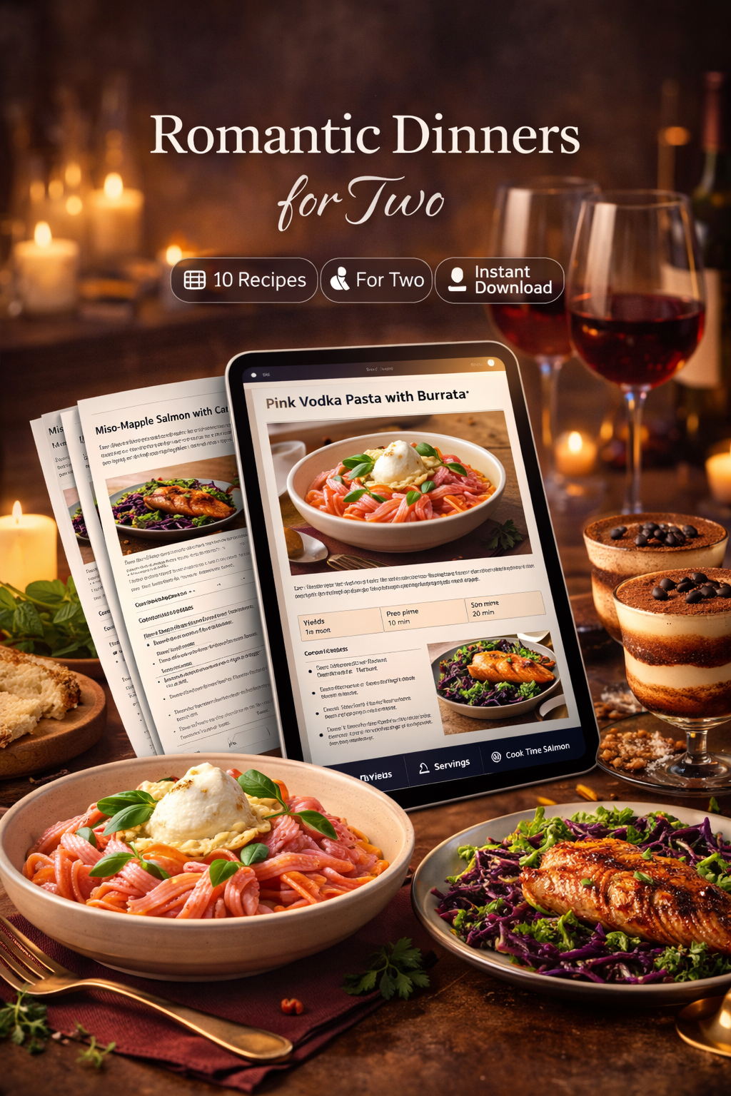 Romantic Dinners for Two is a stylish digital recipe collection featuring 10 elegant recipes for two designed to help couples create meals that feel special, modern, and genuinely memorable.