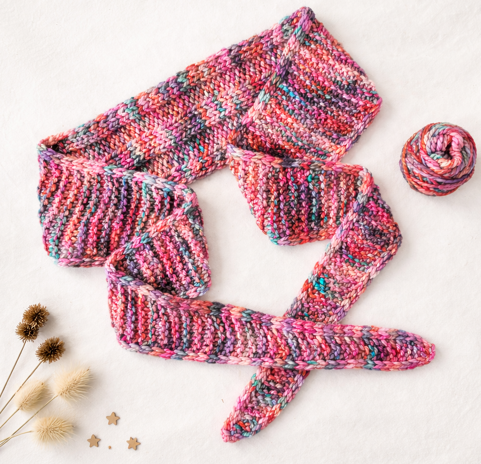 The pattern is written for bulky-weight yarn (Malabrigo Vientos), and it’s a one-skein project.