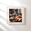 Featuring a tranquil scene seemingly inside a cafe with a coffee mug and croissants placed on a small table. The brushstrokes are strong and sharp, elevating the buttery-gold richness of the croissants. The scene is bathed in harsh sunlight, setting a warm and nostalgic atmosphere. It is somewhat cinematic due to its harsh lights and shadows enhancing the feeling of starting the day with a delicious coffee, preparing yourself for a long and arduous day at work. The overall appeal of the scene invites you to take a moment and consider the days that have gone by. A perfect scenario for adults on their way to see what their day holds for them.