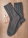 A zoknit száránál kezdve, bumeráng sarokkal kötjük.A leírás tartalmazza a speciális szemek lekötéséhez kat, a csipkemintához diagramokat, és egyedülállóan a bumeráng sarok kötéséhez is egy általam szerkesztett diagramot, valamint mérettáblázatot aminek alapján bármilyen méretben köthetünk zoknit.