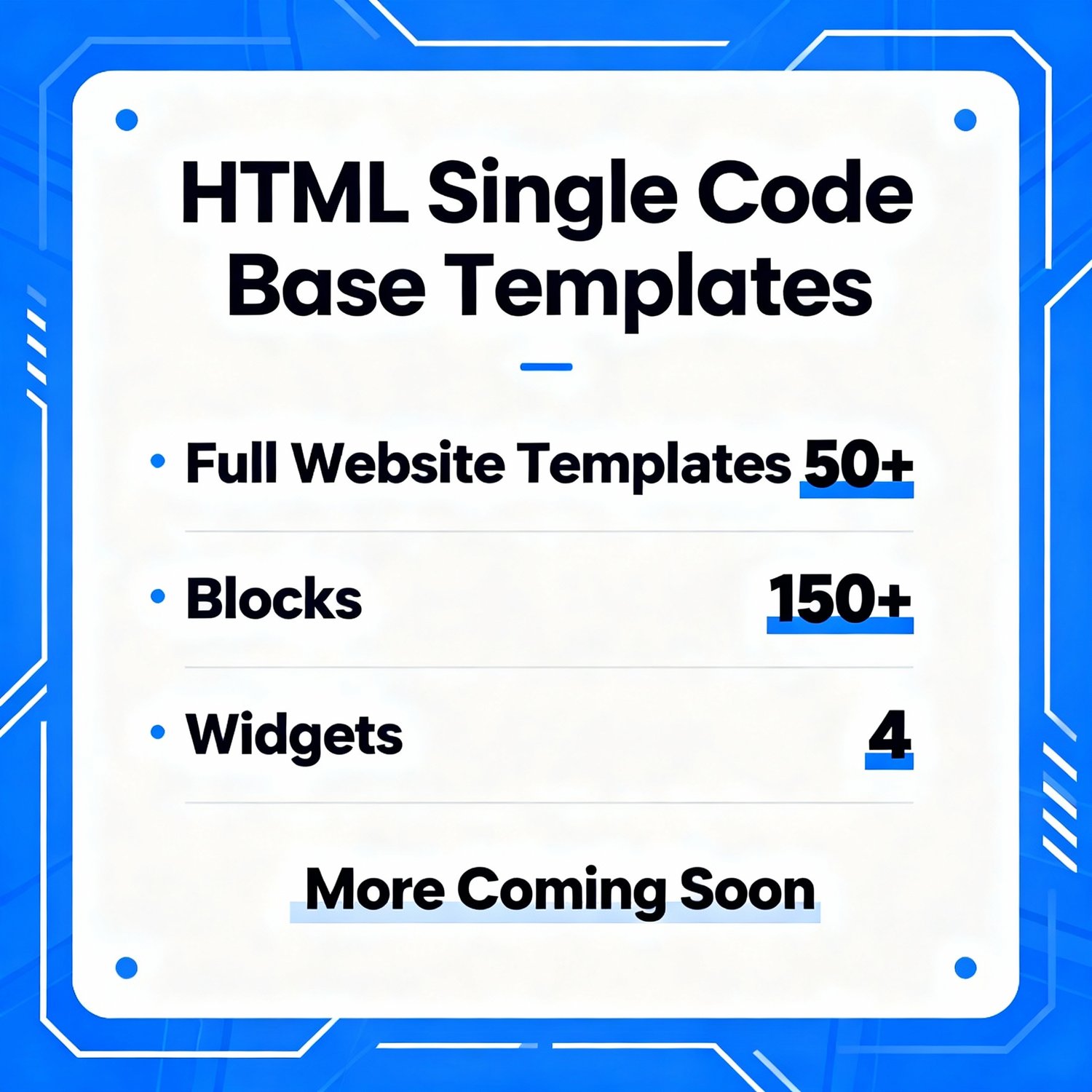 Discover our exclusive collection of HTML Single Code Base Templates, designed to accelerate your business web projects. Choose from 50+ unique full website templates spanning all major business categories, customize with 150+ inter changeable blocks, and enhance functionality with 4 essential widgets. Enjoy seamless integration, modern aesthetics, and future updates—More Coming Soon!