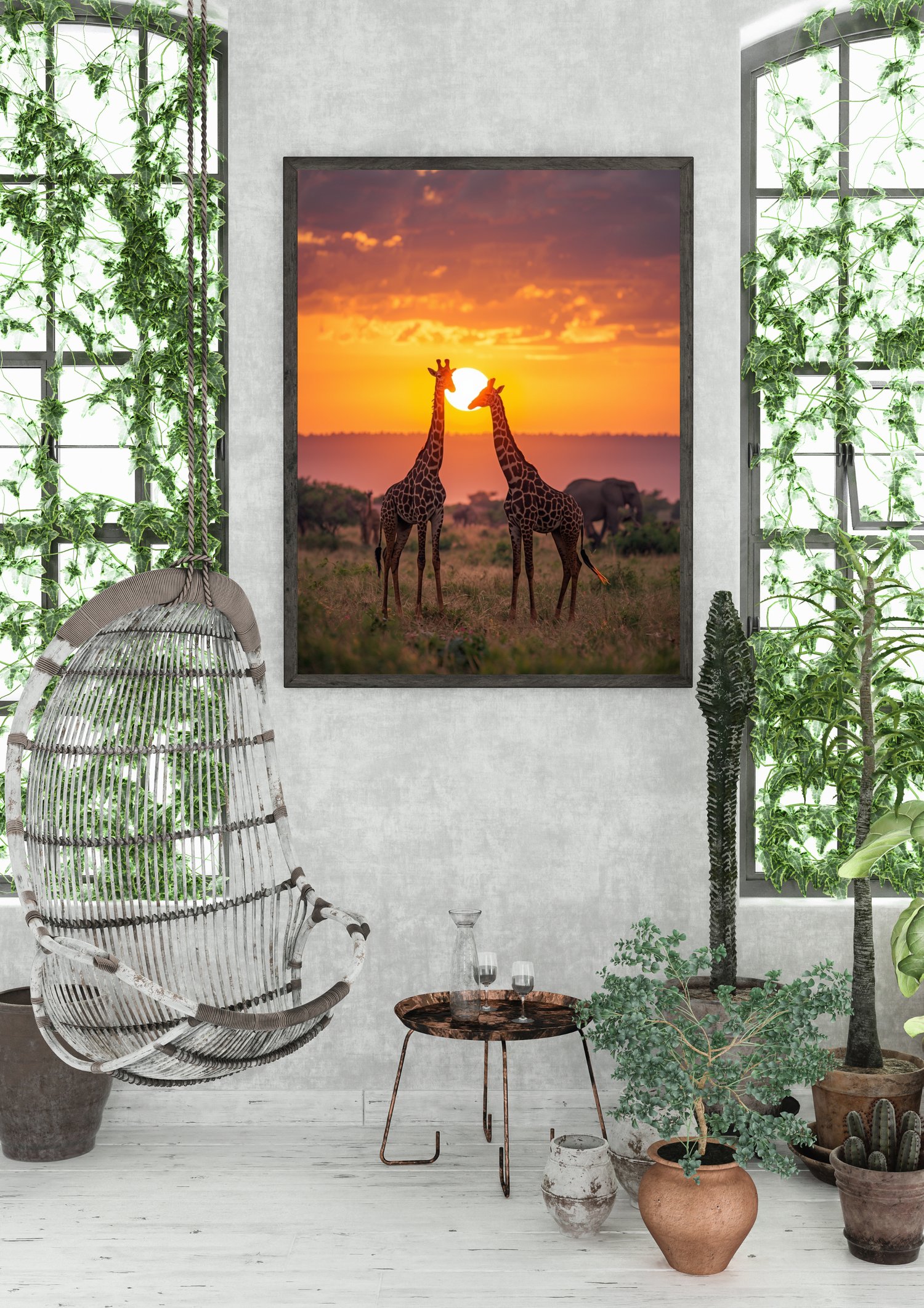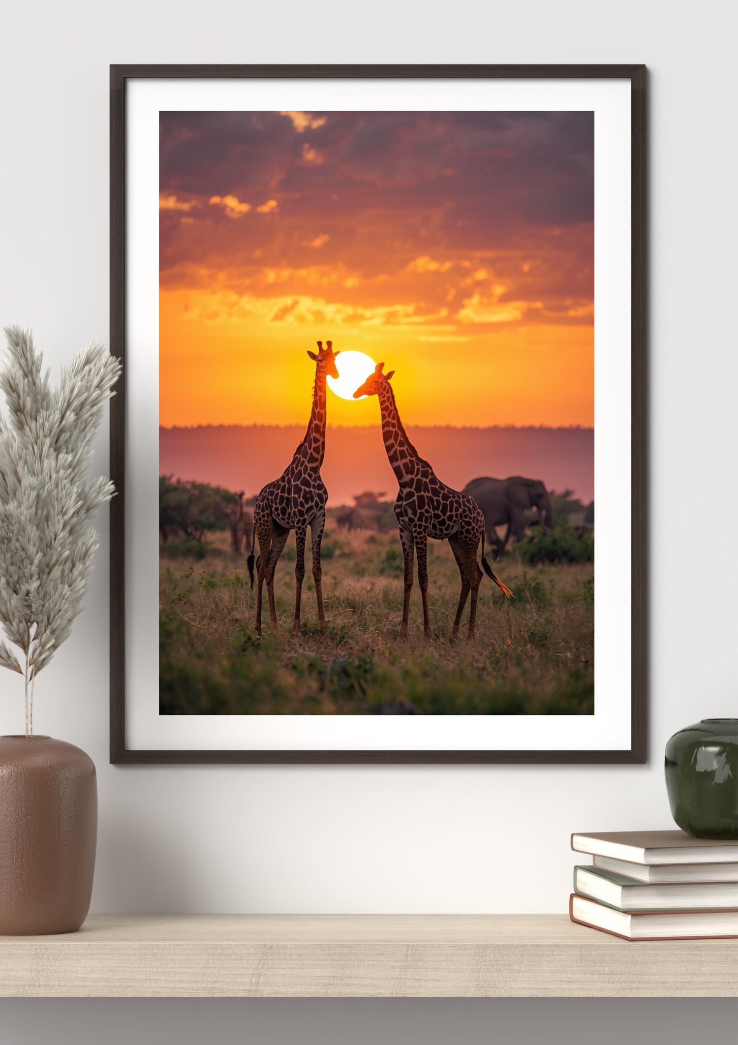 Bring the warmth and beauty of the African savannah into your home with this stunning printable wall art featuring two giraffes at sunset.