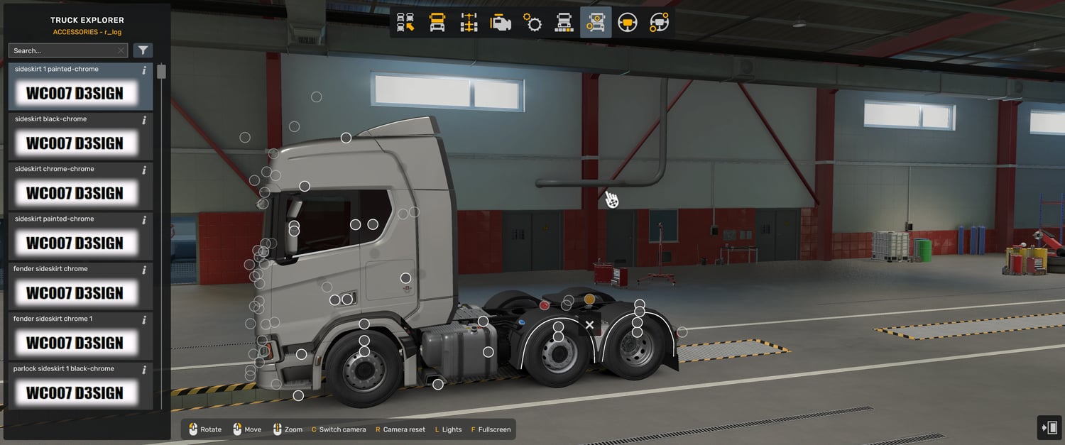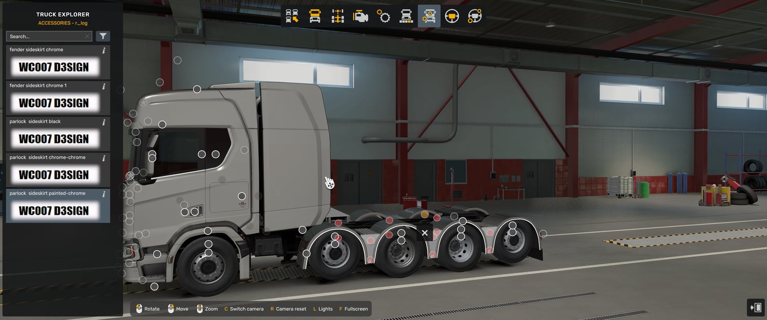 MOD description: chrome sideskirts between rear parlock fenders for Scania Nextgen 6x2 short and long chassis, 8x4, 10x