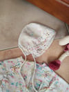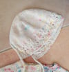 Il comporte un joli motif de dentelle autour du visage. Et des liens en icord, tricotés à la fin.