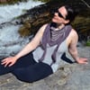 Designer sample knit in 270yds/ 240m per 90g/ 3.17oz sport weight eco yarn: 210yds/ 192m per 70g/ 2.47oz Logwood (MC) and 60yds/ 55m per 20g/ 0.71oz Myrobalan & Iron (CC) Vegan Yarn Capella 100% organic cotton, Fair Trade, hand dyed yarn with 136 glass Japanese Seed beads.