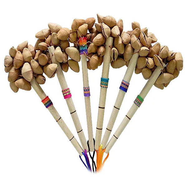 Bamboo wooden stick rattle shaker music instrument with cacho seed pods and a cotton strap on handle.