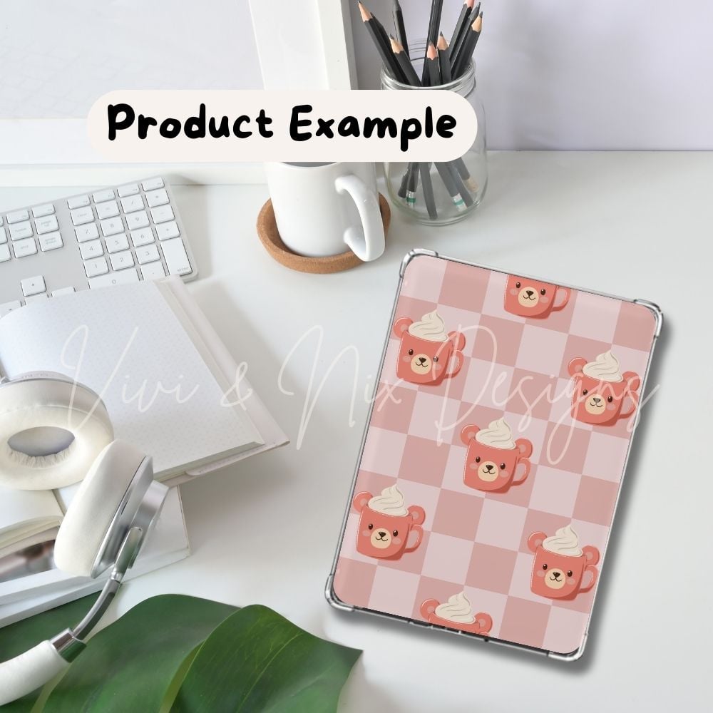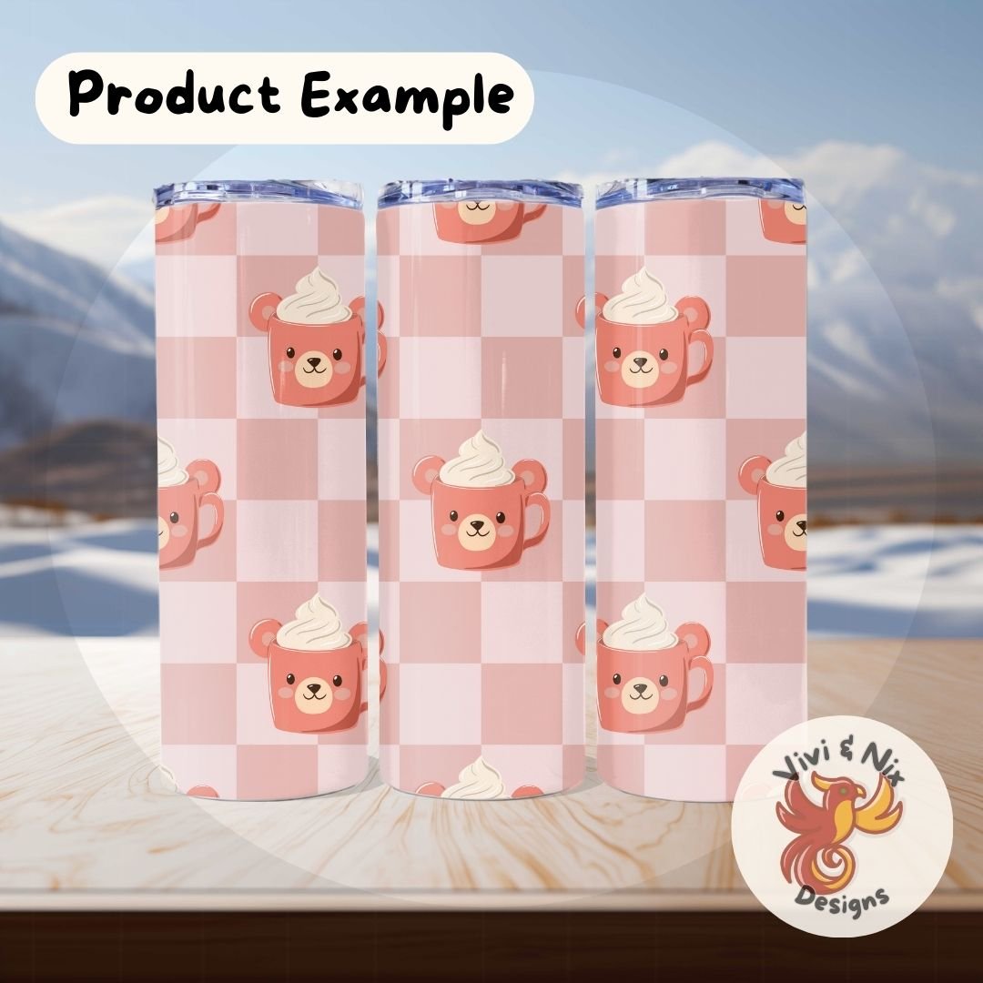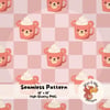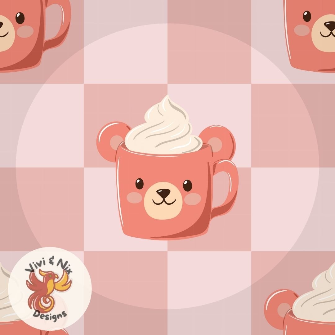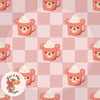 This free seamless pattern features an adorable bear mug with whipped cream set on a soft blush checker background β perfect for early Valentine projects, winter crafting, and cozy designs you can save and use later.