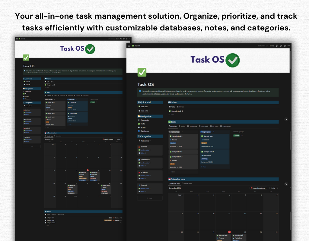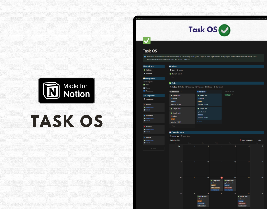 Task OS is a comprehensive Notion template designed to help you effectively manage your tasks, projects, and daily life. With its customizable databases, intuitive features, and powerful integrations, Task OS provides a streamlined workflow for staying organized and productive.