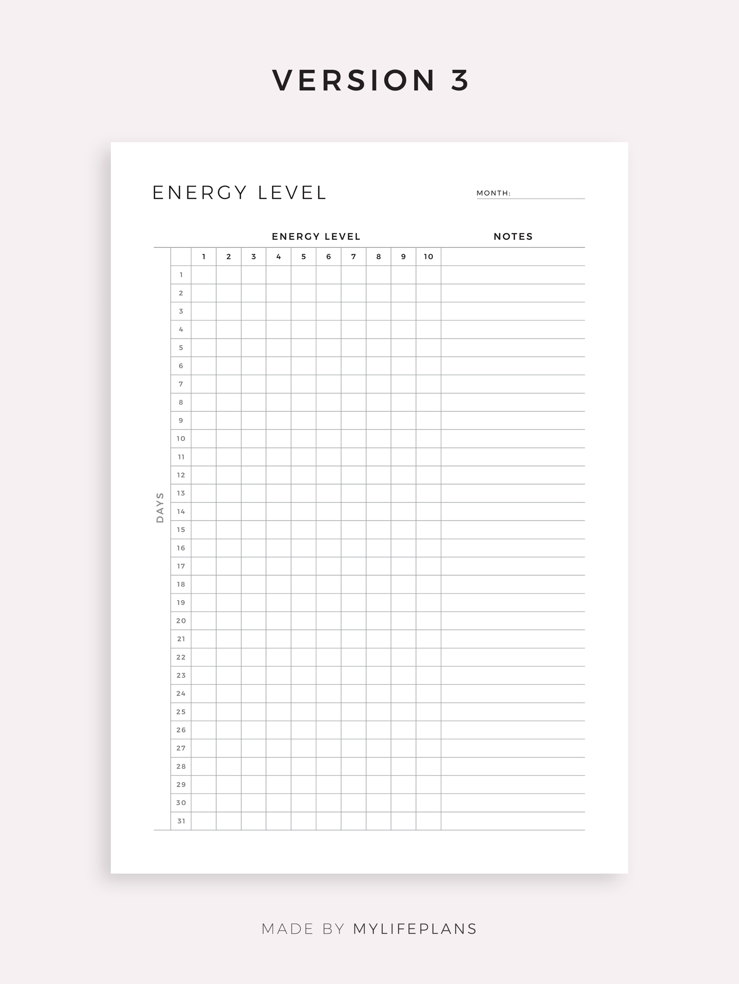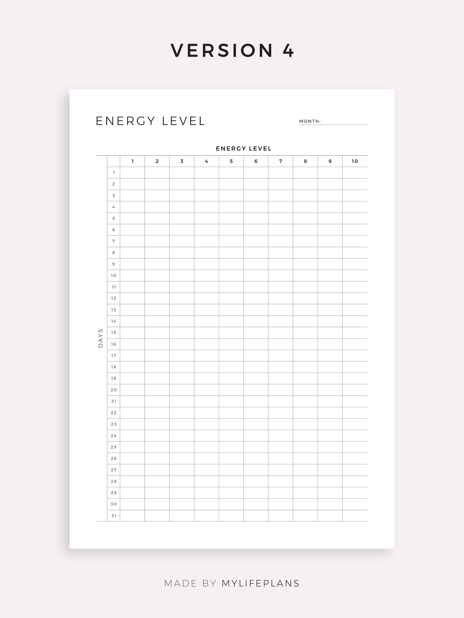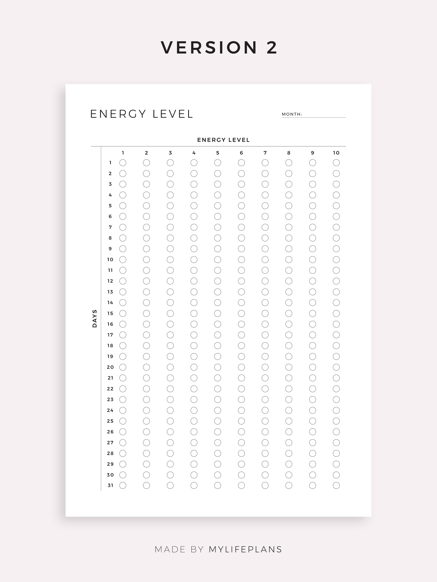 This is a printable daily energy level tracker — just download, print, and start using it right away.