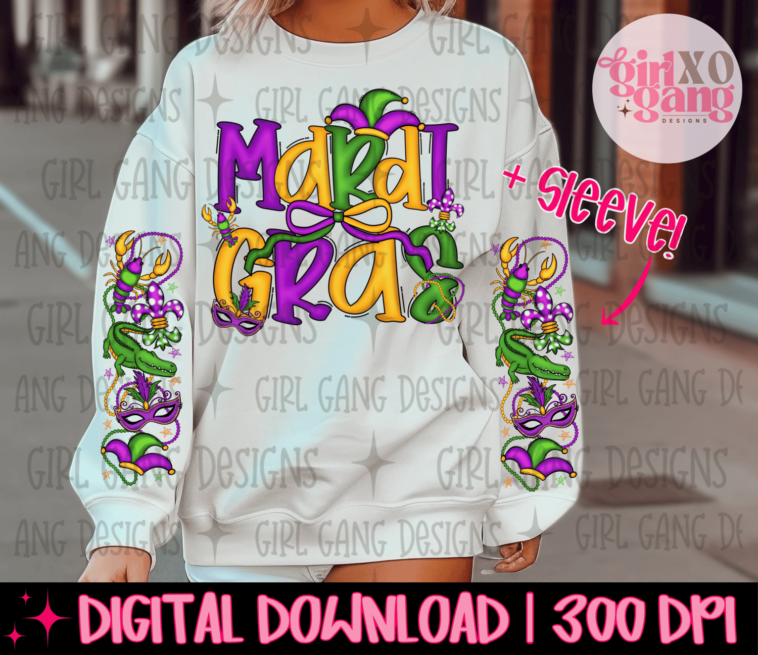 Mardi Gras doodle png with sleeve , purple green gold trendy Mardi Gras design, preppy alpha Mardi Gras coquette