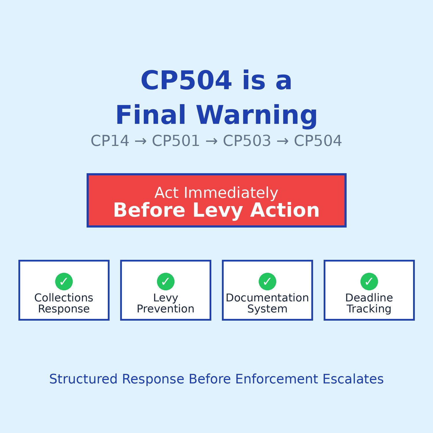 A CP504 is serious — but it is not yet a full wage or bank levy notice. That comes later (CP90 / LT11).